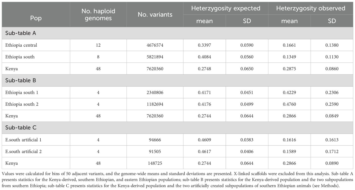 We performed additional analyses probing the relationships between the two distinct populations from southern Ethiopia and the Kenya-derived population. The two southern Ethiopian populations were composed of animals collected either from the Arero Forest and northern Borena National Park (s. Ethiopia population 1) or the Megadu block of Borena National Park (s. Ethiopia population 2). The collection sites for these two populations are separated by mountainous terrain and a lava field (Zemlemerova et al., 2021). The f3 statistics (Patterson et al., 2012) were significantly greater than zero for each population versus the other two (Table 2B), indicating no recent admixture. When considered separately, both southern Ethiopian populations had observed heterozygosity that matched expectation (Table 3B). To control for the limited population sizes of these groups (two animals/four haplotypes per population), we swapped membership to create two artificial, mismatched populations. Like the combined southern Ethiopian animal group (Table 3A), these two artificial populations both exhibited far less heterozygosity than would be expected by chance (Table 3C).