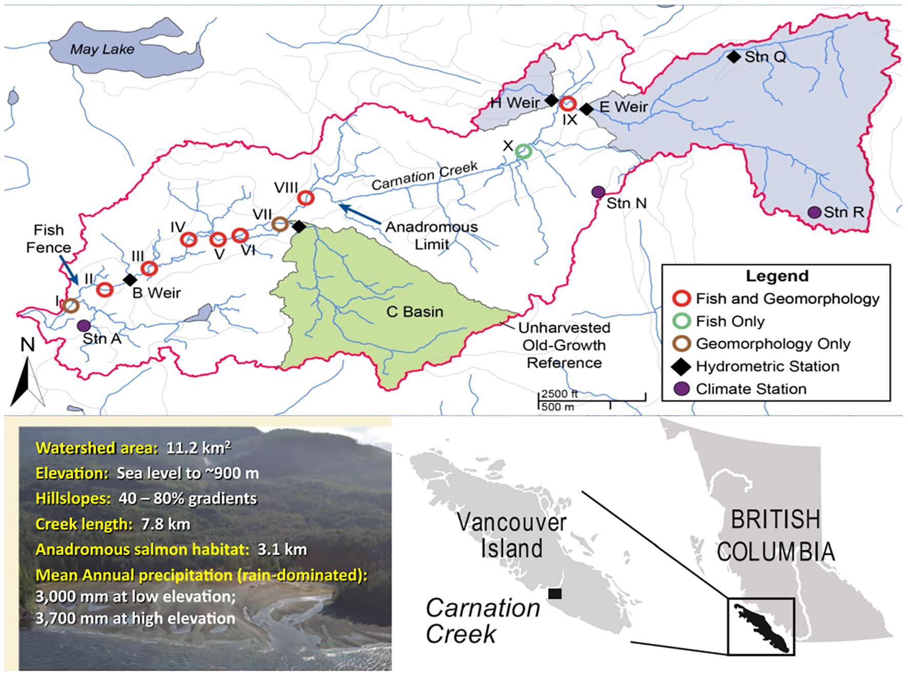 The Carnation Creek Watershed Experiment is a long-term, multi-disciplinary case study of the effects of historic and current forestry practices on a small salmon-bearing, coastal watershed. Located in southwestern Vancouver Island British Columbia (B.C.)., Carnation Creek is a small stream; approximately 7.8 km long that drains an area of approximately 11.2 km2 (Figure 1). Initiated in 1970, the investigation is now in its 55th year of continuous research and monitoring and has generated the longest time series of continuous data on fish-forestry interactions at the watershed scale available anywhere.