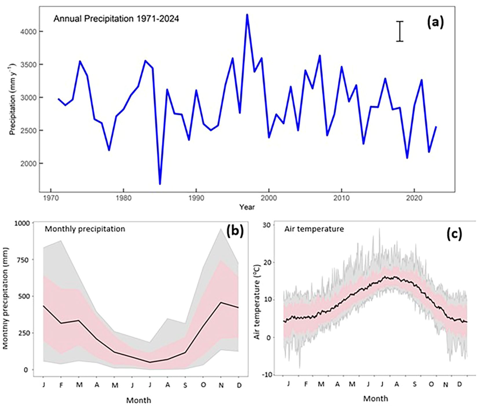 Figure 2. (a) Annual precipitation at station A 1971 to 2024. The bar indicates ±5% uncertainty. Similar inter-annual variability is seen at other locations in the watershed and at Tofino, about 70 km to the west. (b) Mean, maximum, minimum and the 90th and 10th percentiles of monthly precipitation (mm) at station A for 1971 to 2024. (c) Mean, maximum, minimum and the 90th and 10th percentiles of daily average air temperature (°C) at station A for 1971 to 2024. The dashed line corresponds to 0 degrees.