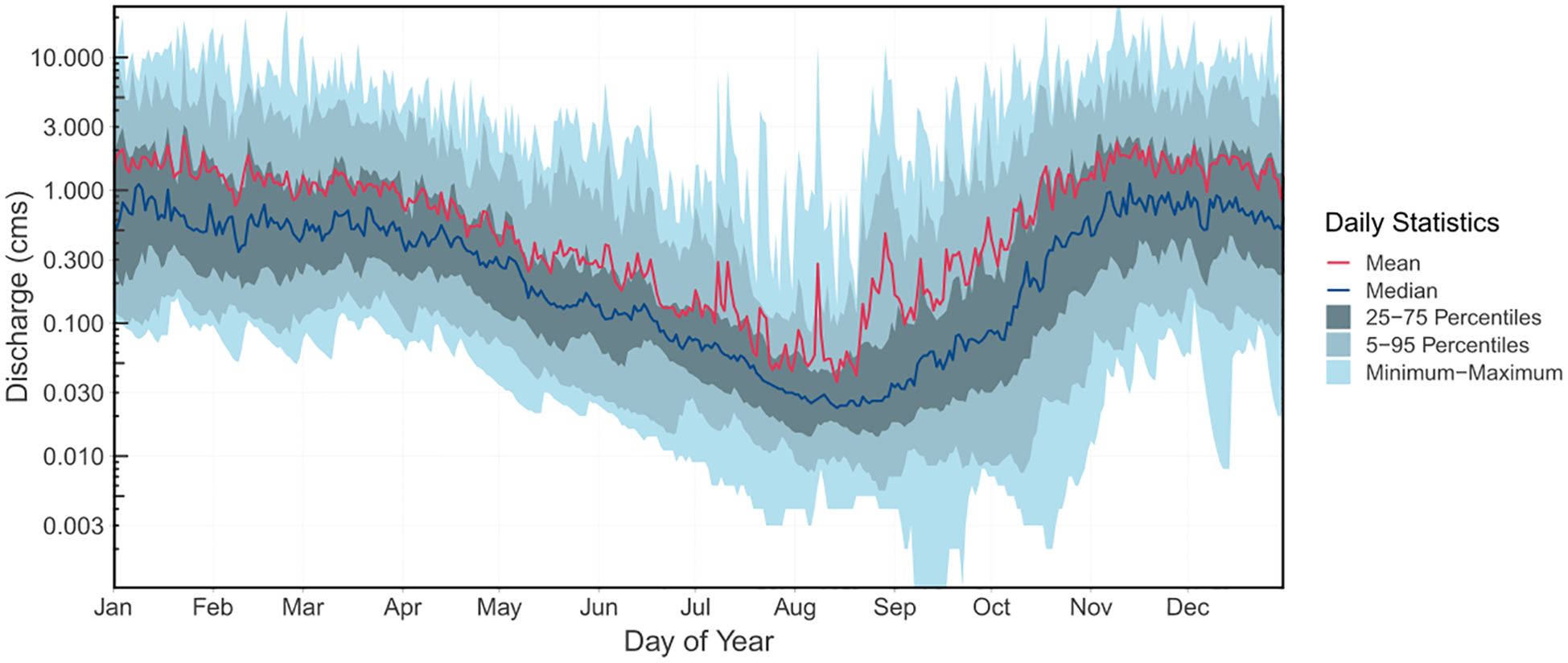 Figure 3. Long term streamflow (daily discharge percentiles) for water survey Canada hydrometric station 08HB048, Carnation Creek at the mouth, 1973-2023. Note the logarithmic y axis.