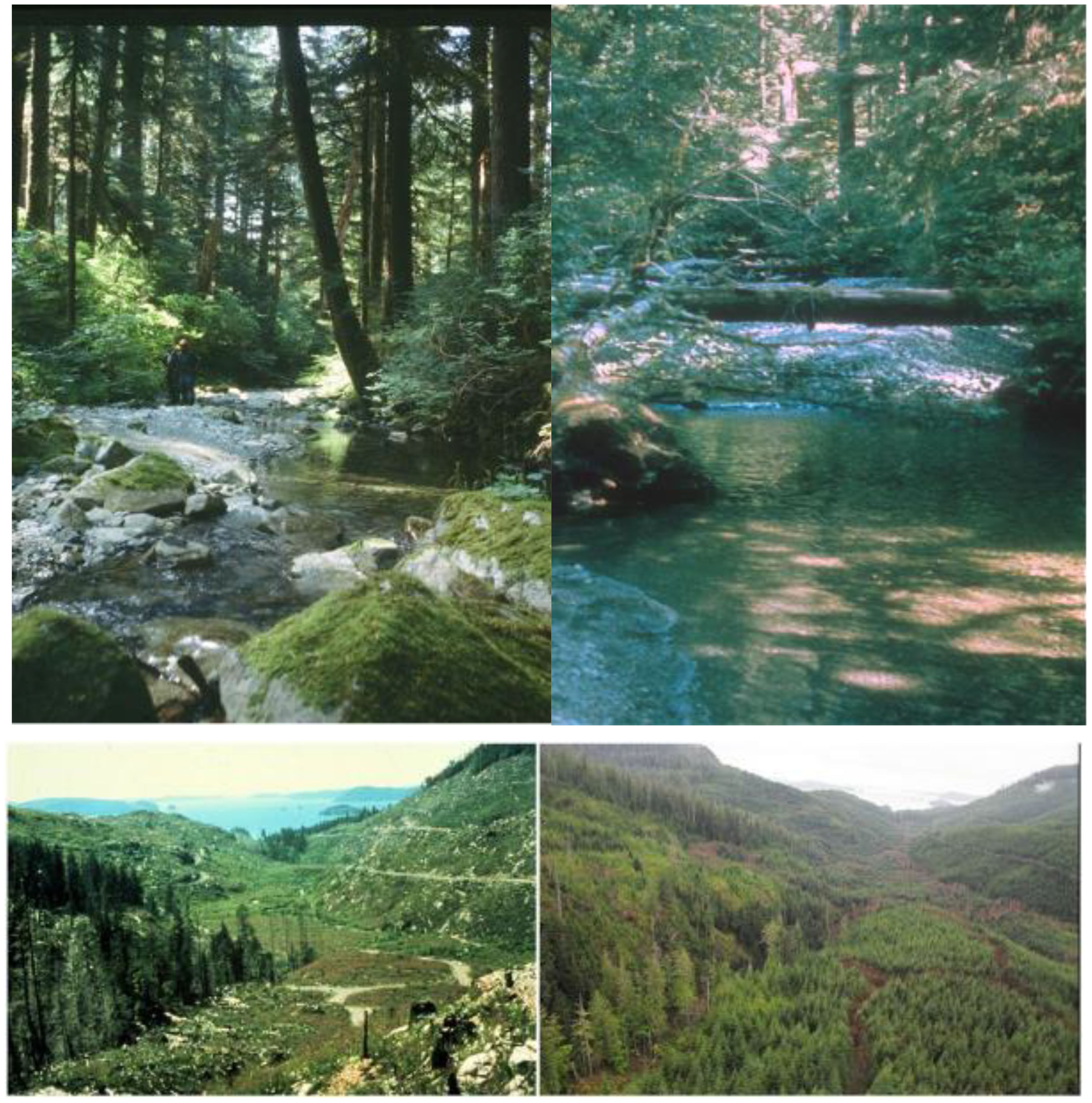 Figure 4. Pre-logging view of Carnation Creek in the headwater sub-basin upstream of the anadromous barrier (top left; coastal cutthroat trout habitat) and in the anadromous reach of the stream (top right). Bottom left: seaward view of the lower 3.5 km of Carnation Creek in 1981 after 41% of the watershed was logged at the end of the main phase of forest harvesting. Bottom right: seaward view from a similar vantage point in 2004 after 21–28 years of forest regrowth depending on the age of individual cutblocks.