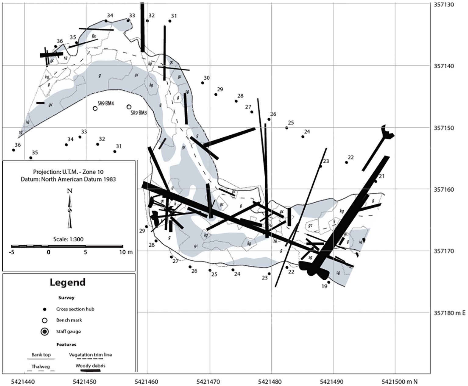 Figure 6. Annual stream channel morphology and aquatic physical habitat surveys are conducted in eight permanent study sections that overlap with fish population assessment sites. An example study area is shown here. Pool and riffle habitat areas, channel bed elevations, pool depths, LWD (logs numbered, measured, and mapped), streambed sediment size composition, gravel bars (shaded areas), and annual bank erosion and channel scour and deposition are measured from topographic surveys.