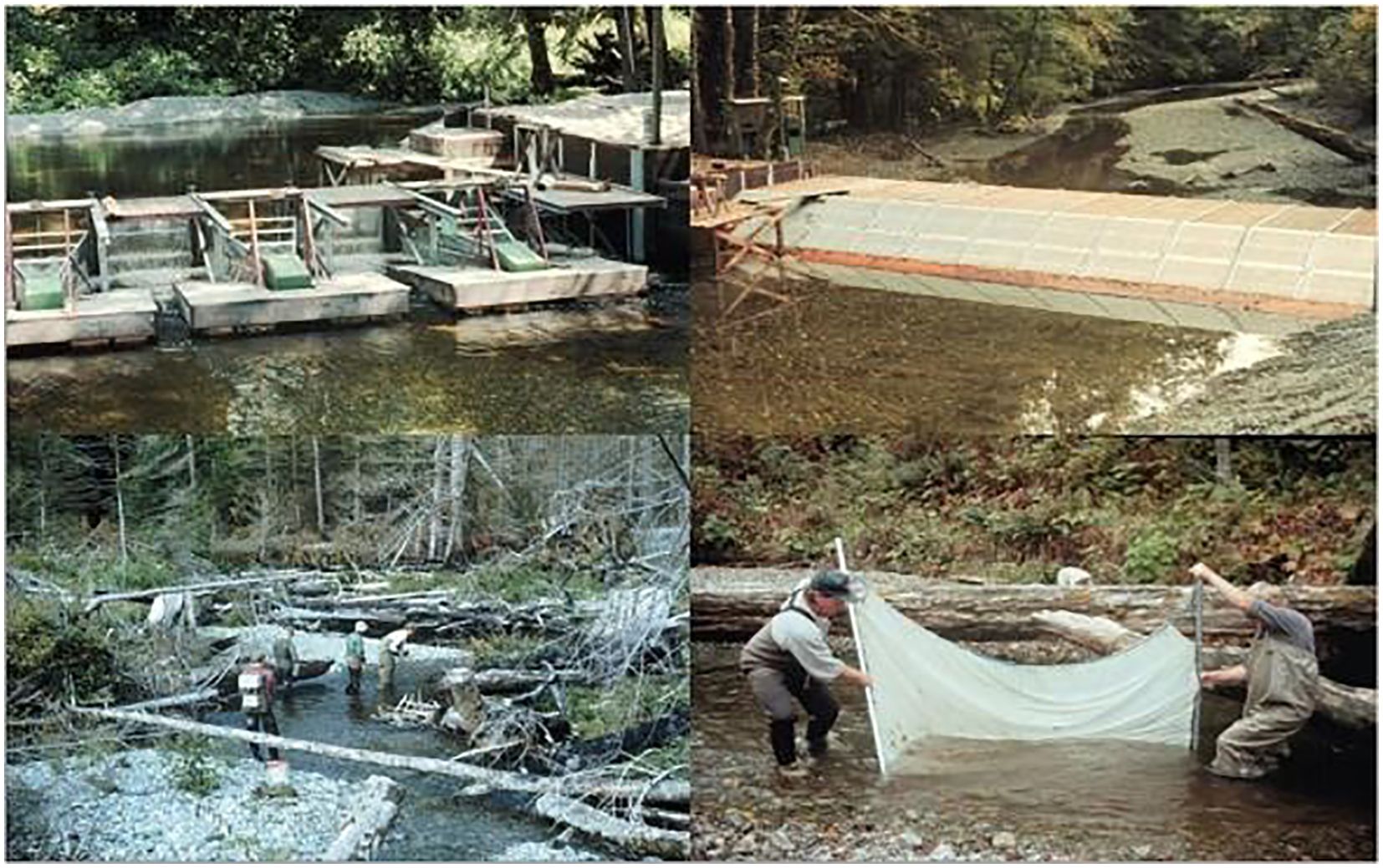 Figure 7. Adult and juvenile salmonid studies. Top left: fish fence configured to intercept seaward‐migrating salmonid smolts and fry (young of the year) in spring (looking upstream). Top right: fence configured to intercept adult spawners entering the stream from the ocean in the autumn (looking downstream). Bottom: summer assessments of populations rearing juvenile salmonids by a two‐catch removal method with electrofishing (left panel) and pole seining (right panel) in one of eight permanent survey sections.