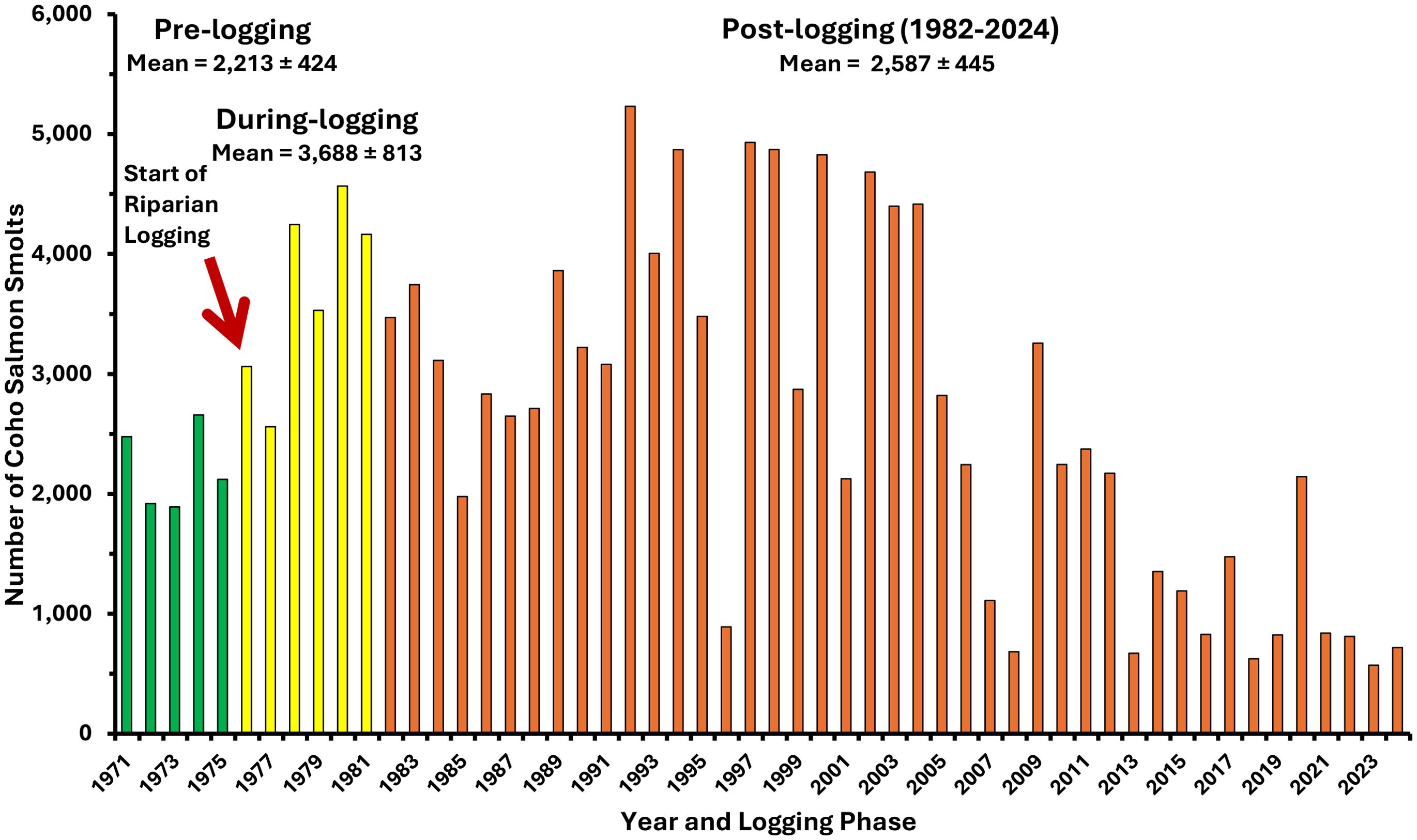 Figure 8. Numbers of coho salmon smolts produced from Carnation Creek from 1971 to 2024. Logging phases are color coded (pre-logging in green, during-logging in yellow, and post-logging in orange). Interannual variation is shown by means provided with ±95% confidence intervals.