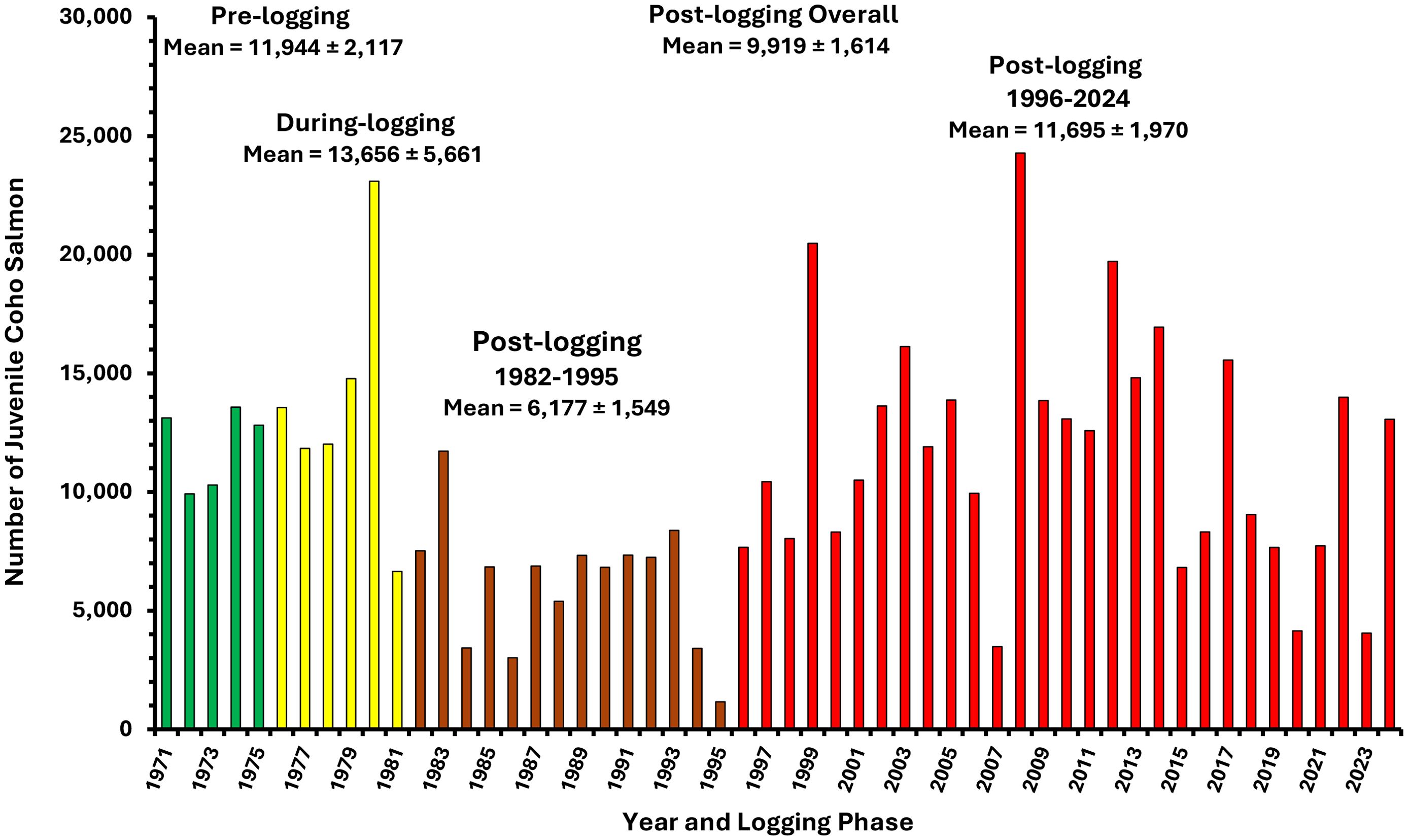 Figure 9. Numbers of juvenile coho salmon (fry and yearlings) rearing in Carnation Creek from 1971 to 2024. Logging phases are color coded as described in Figure 8 with the post-logging period after 1995 shown in red to identify years affecting juveniles after commercial and recreational fisheries were limited or closed. Means are provided with ±95% confidence intervals. Note: time series data are distributed normally (Shapiro–Wilk W = 0.96, p = .09) with no significant first‐order autocorrelation (Durbin Watson 1.54, p = .21).