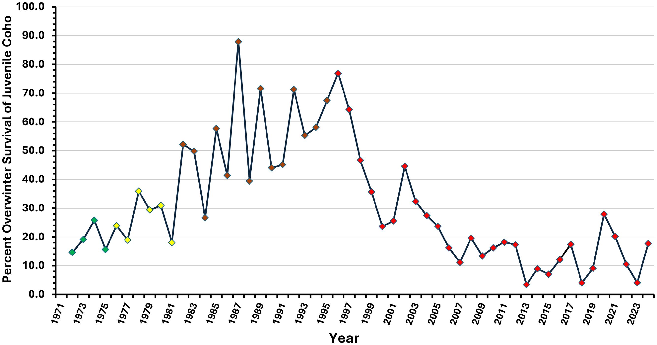 Figure 10. Changes in the percentage of juvenile coho salmon (fry and yearlings) surviving the winter at Carnation Creek from 1971 to 2024 to migrate seaward as smolts in the following spring. Data points are color coded as described in Figure 8 to indicate logging phases and to distinguish post-logging years affecting juveniles after fisheries commercial and recreational fisheries were restricted or closed.