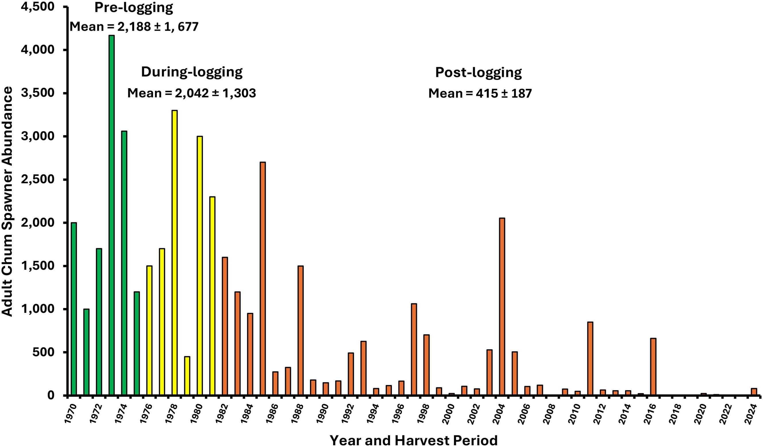 Figure 11. Numbers of adult chum salmon spawners entering Carnation Creek from 1971 to 2024. Logging phases are color coded (in green, during-logging in yellow, and post-logging in orange). Interannual variation is shown by means provided with ±95% confidence intervals.