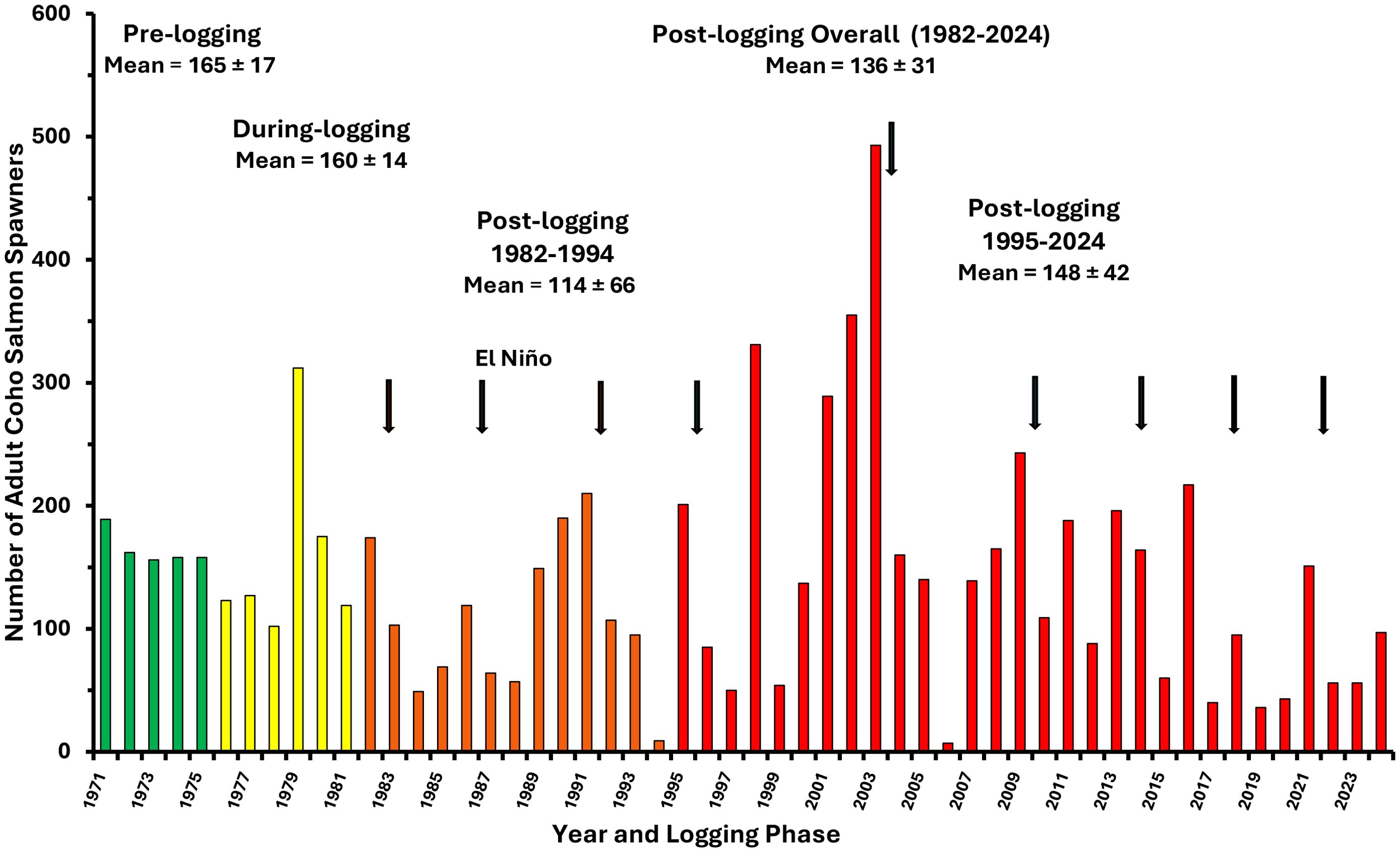 Figure 12. Numbers of adult coho salmon spawners entering Carnation Creek from 1971 to 2024. Logging phases are color coded as described previously with post-logging years when fisheries were restricted or closed shown in red. Interannual variation is shown by means provided with ±95% confidence intervals. Vertical arrows represent El Nino (warm water) conditions off coastal BC unfavorable for salmon growth and survival in the marine environment.