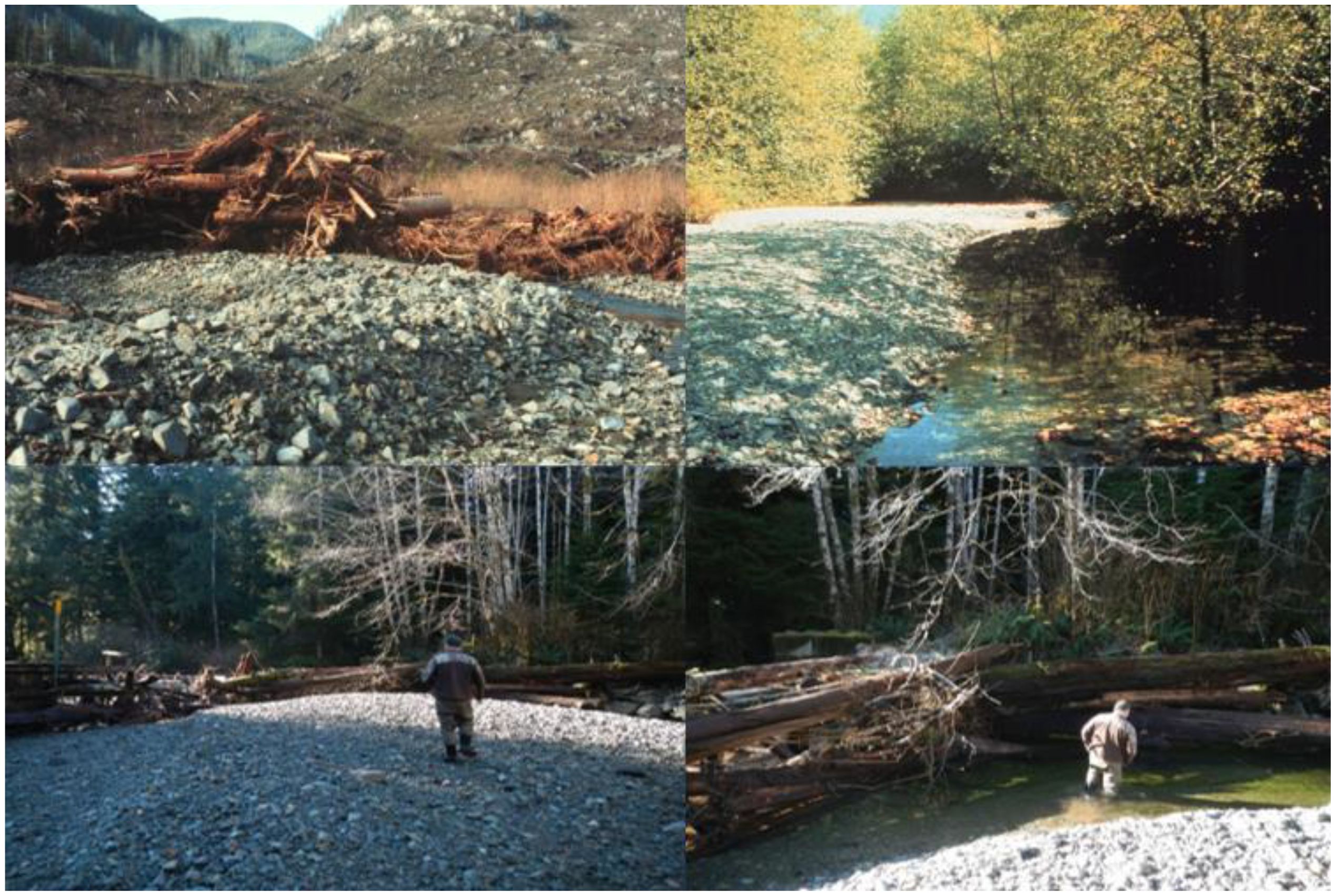 Figure 13. Landslides and long-term changes in channel characteristics. Clockwise from top left: (1) downstream face of the major logjam near the head of anadromous salmon habitat caused by the winter 1984 landslide that has driven the majority of long‐term channel and aquatic habitat impacts; (2) post-logging channel 1.6 km upstream from the mouth, 2–3 times wider than in pre-logging years with loss of LWD, little riparian LWD source remaining, and unstable sediment wedge and midchannel due to post-slide logjam (behind photographer); (3) and (4) Annual storm transported sediments (> 420 m3) and woody debris stopped at the fish fence near the stream mouth.