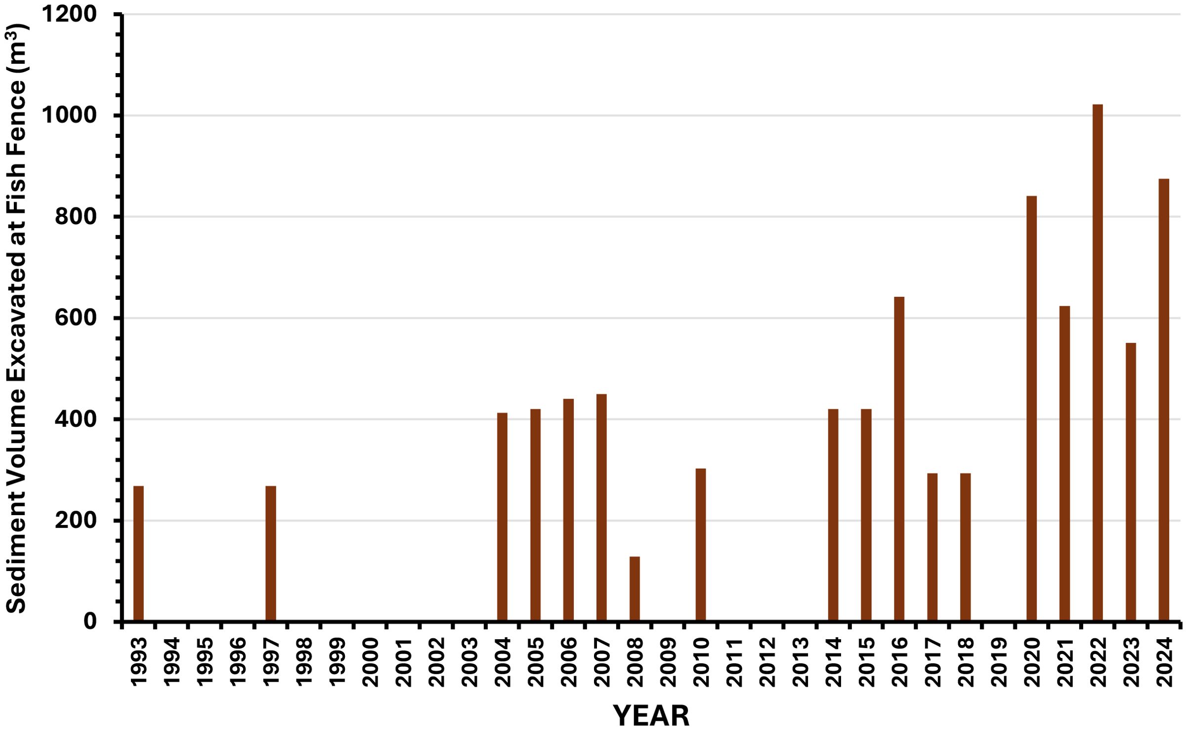 Figure 14. Excess storm-delivered sediments excavated from the fish fence. Since 1993, nearly 8,700 m3 of sediments have been excavated from the footings of the fence and nearby channel in order to operate the facility. The frequency of the excavations and volumes removed have increased over time. Nearly 70% of the total amounts excavated since 1993 have been removed between 2014 and 2024. Coincident with the loss of stable in-stream wood, this indicates on-going and increasing channel instability. No sediment was excavated during years with no bars shown in the figure.