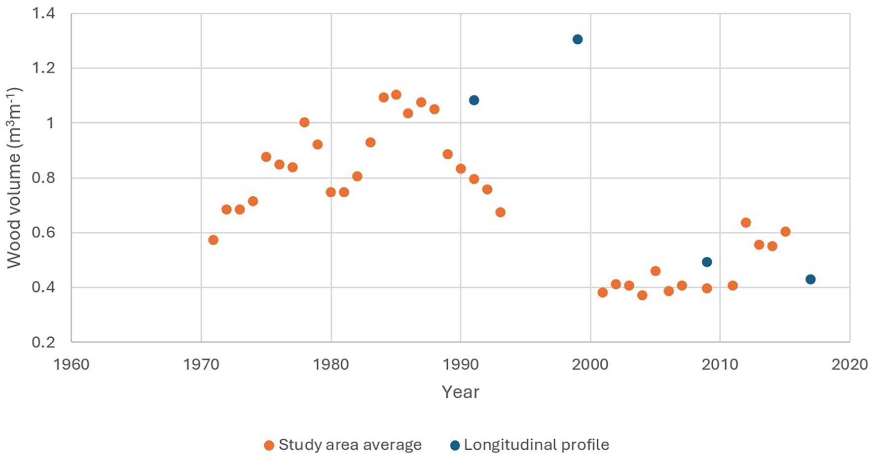 Data on in-stream wood collected in the eight geomorphic study sections and along the full 3.1 km of anadromous fish habitat reveal dramatic patterns in wood abundance through time (Figure 15). Additions of stable, functional wood to the channel were effectively eliminated following clearcut timber harvesting along 1.8 km of the stream in spite of riparian trees retained along the lowermost 1.3 km of channel within the variable-width riparian buffer treatment. Therefore, the available wood was limited to that already in the channel for most of the stream length. This wood has subsequently decayed, with a loss of large, channel spanning jams (Reid and Hassan, 2020).