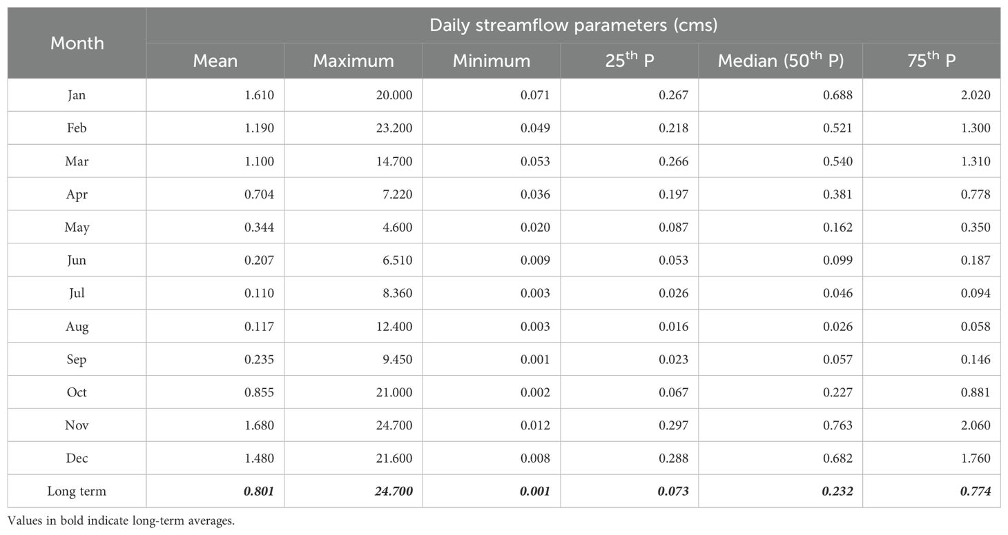 The long-term average mean annual discharge at Carnation creek is 0.801 cubic meters/second (cms, Table 1). Stream discharge at Carnation Creek has varied from 5 to 23.2 cms (annual daily average) with maximum instantaneous flows ranging from 11 to 65 cms. Low flows occur primarily in the summer to early fall periods (Figure 3) but can also occur in the wintertime in absence of rainfall (Table 1). On an annual basis, low flows typically range from 0.001 to 0.091 cms (daily average). Table 1 summarizes the 1973 to 2023 long-term flow statistics for Water Survey Canada (WSC) Hydrometric station 08HB048 Carnation creek at the mouth.