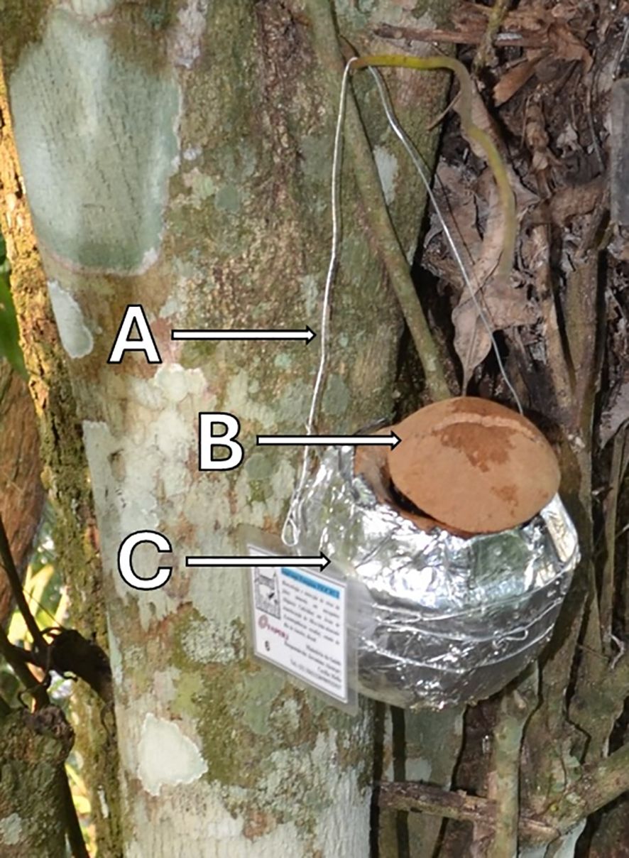 The capsules used were globose, with diameters ranging from 12 to 18 cm, based on morphological descriptions of the species reported in previous botanical studies (Prance and Mori, 1979; ITTO, 2025; NPARKS, 2025). Each trap was prepared by covering the outer surface of the capsule with an asphalt membrane to prevent permeability through the natural walls and minimize water loss by infiltration. The original operculum of the fruit was used as a lid, positioned to remain slightly open, allowing access for females to oviposit while simultaneously reducing the evaporation rate of the water accumulated inside. For field deployment, a metal wire was attached to opposite sides of the capsule’s edge near the opening, forming a small hanging basket and allowing the traps to be easily secured to branches or tree trunks (Figure 2).