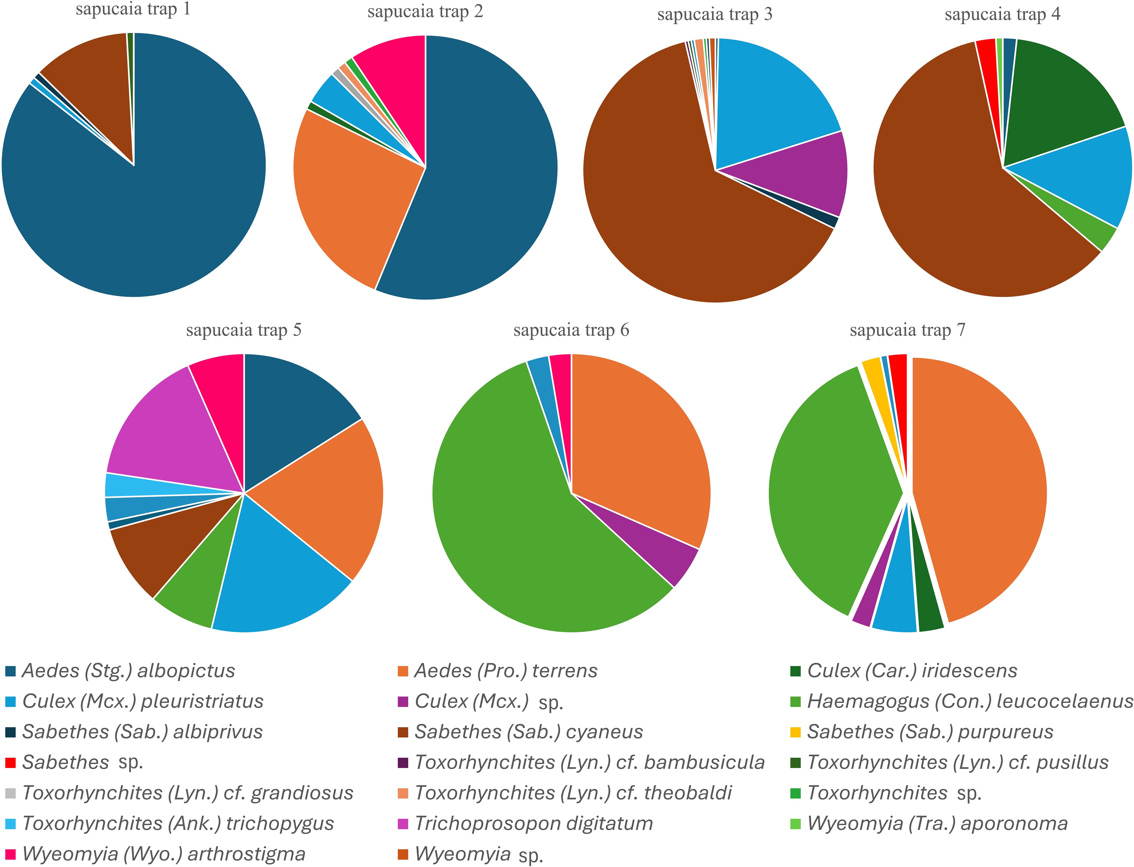 Additionally, trap 3 exhibited the highest richness of Toxorhynchites species (Tx. cf. (Lyn.) bambusicula, Tx. cf. (Lyn.) pusillus, Tx. cf. grandiosus, and Tx. cf. theobaldi), all predatory larvae. Trap 5 exhibited a high evenness index, with a relatively balanced distribution of species. Notable representatives included Ae. albopictus (n = 17; 16%), Ae. terrens (n = 21; 20%), Cx. pleuristriatus (n = 19; 18%), Hg. leucocelaenus (n = 8; 8%), Sa. cyaneus (n = 10; 9%), Trichoprosopon digitatum (Rondani, 1848) (n = 17; 16%), and Wy. arthrostigma (n = 7; 7%). Traps 6 and 7 were noteworthy for their high abundance of Hg. leucocelaenus, an important YFV vector, with 22 individuals (58%) collected in trap 6 and 48 individuals (38%) in trap 7. In trap 6, Ae. terrens was the second most abundant species (n = 12; 32%), whereas in trap 7 it was the most abundant overall, with 58 individuals (46%) (Figure 3).