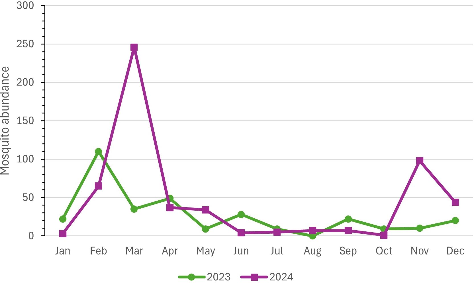 Our data show that environmental temperature and precipitation patterns between January 2023 and December 2024 significantly altered mosquito population dynamics, primarily by favoring the development of immature stages through the formation of optimal breeding habitats. Consequently, abundance peaks were observed February, March, and November. These findings highlight the strong influence of seasonal climatic factors and further confirm the established role of temperature and rainfall as key drivers of mosquito population fluctuations (Reinhold et al., 2018).