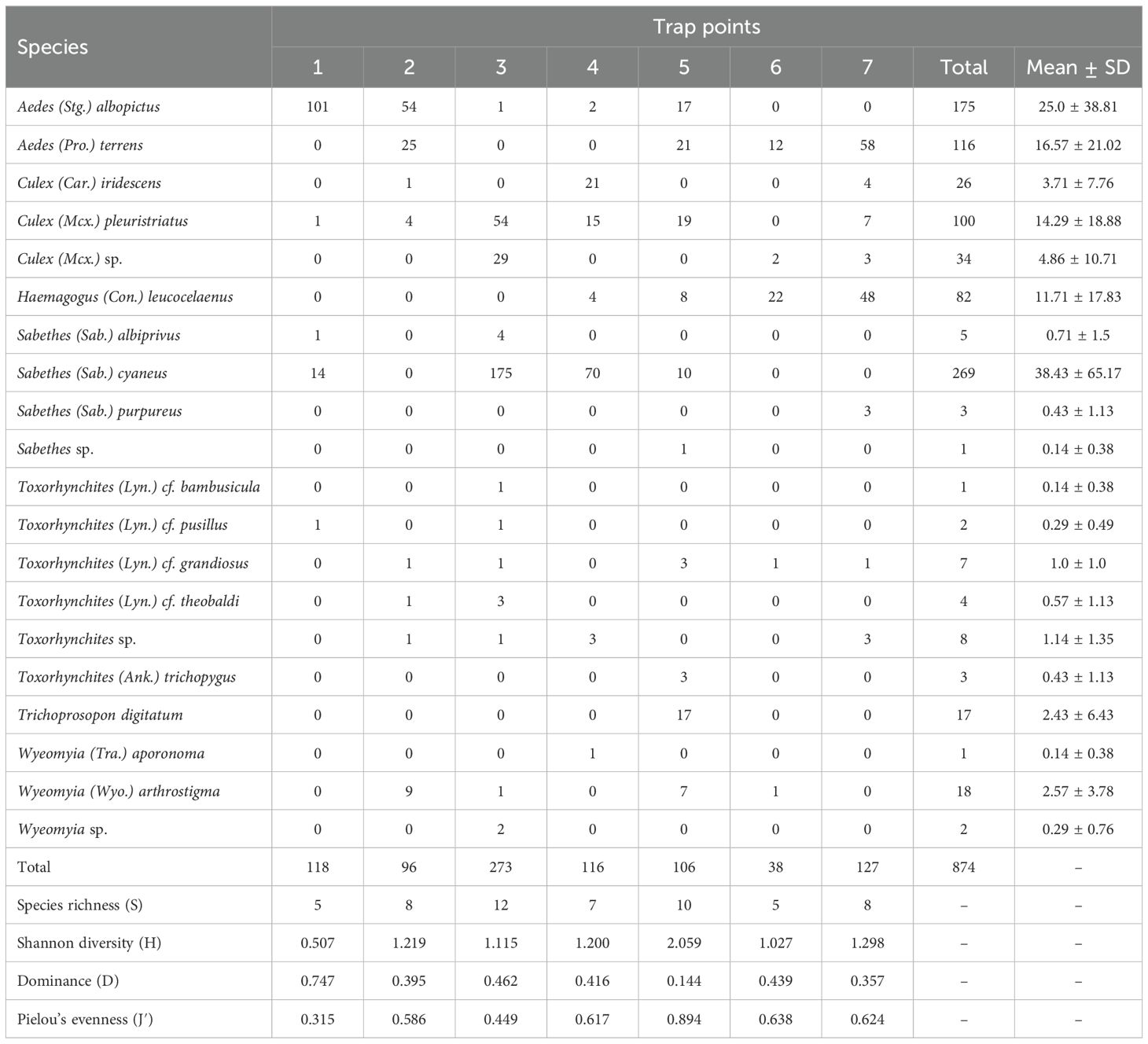 The high Pielou’s evenness index (J = 0.89) observed in trap 5, along with the highest Shannon diversity index (H = 2.06), indicates a more ecologically stable environment where multiple species coexist without marked dominance. This pattern is commonly associated with habitats that have a balanced distribution of resources and favorable environmental conditions (Magurran, 2021). In contrast, trap 1 showed dominance of Ae. albopictus (86%), a highly adaptable species often linked to anthropized areas (Juliano and Philip Lounibos, 2005). The abundance of this species may reflect local environmental changes, such as increased sunlight exposure, reduced vegetation cover, and/or greater human influence.