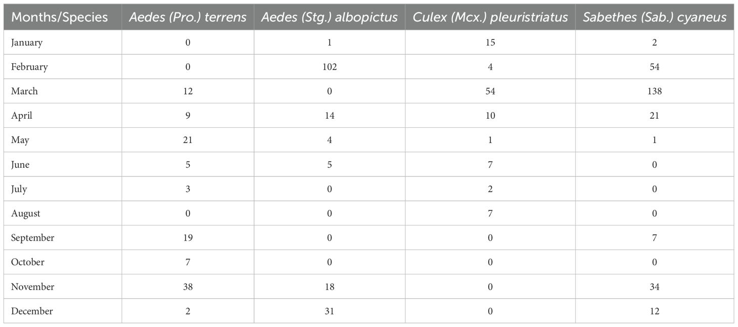 Collections were conducted monthly on a single day between 9:00 a.m. and 4:00 p.m., from January 2023 to December 2024. This sampling design enabled continuous monitoring of the mosquito fauna across seasonal variations.