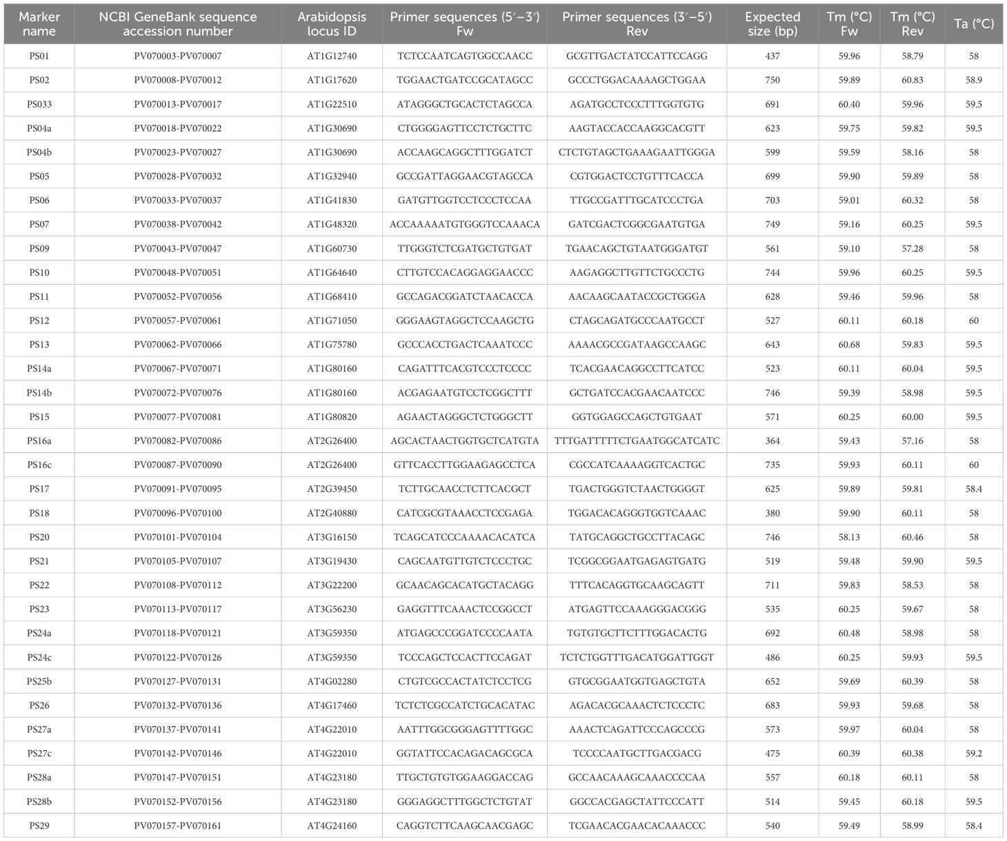PCR amplification was conducted in a total volume of 24.2 µl, of which 1 µl was genomic DNA (about 20 ng), 0.18 µl DreamTaq DNA polymerase (Fermentas, Szeged, Hungary), with, 4.5 µl (10×) Dream Taq Green PCR buffer (ThermoFisher, Waltham, MA, USA), 3 mM MgCl2, 200 μM of dNTPs, 1% BSA, 0.2 mM of each primer and Milli-Q ultrapure water (Merckmillipore, Billerica, MA, USA). The PCR protocol was as follow: (1) pre-denaturation at 94°C for 3 min; (2) 32 cycles at 94°C for 30s; (3) annealing at 58 or 60°C for 45s; and (4) extension at 72°C for 1.2 min, and a final elongation at (5) 72°C for 7 min. For markers with multiple bands, further optimization was achieved via an increase up to 60°C in the annealing temperature. The PCR products were analyzed on a 1.5% (w/v) ethidium bromide-stained agarose gel in 1xTBE buffer to verify the amplification.