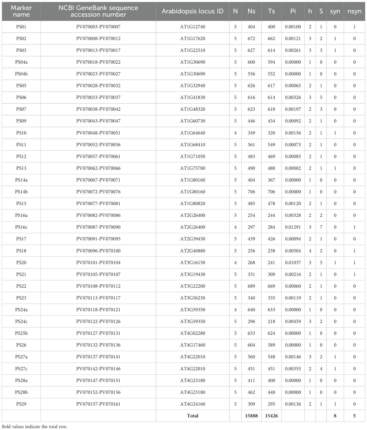 Table 2. Genetic characteristics of 33 newly developed markers of pH responsive genes in Scots pine genotypes, N: Number of sequences; Ns: Number of sites (alignment length); Ts: Total number of sites (excluding sites with gaps/missing data); Pi: Nucleotide diversity; h: Number of haplotypes; S: Number of polymorphic (segregating) sites; syn: synonymous mutations, nsyn: non-synonymous mutations.