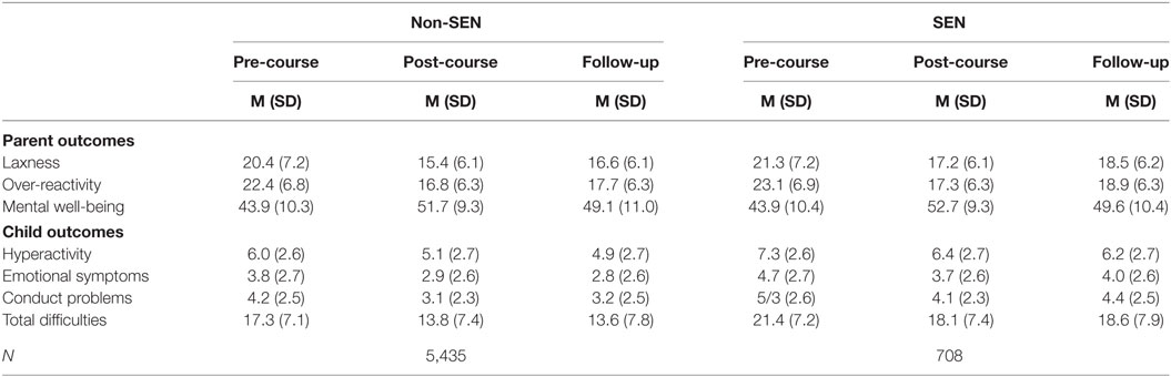 Using data from the evaluation of the national roll out (Lindsay et al., 2011), our first research question aimed to understand whether EBPPs were as effective for parents with a child with SEN as they were for parents whose children did not have SEN. A narrative review of available evidence suggested that it is likely that parenting programs developed for the general population are effective for children with developmental disabilities (Petrenko, 2013), but the review was not systematic and the suggestion was not empirically tested. A recent meta-analysis supported the effectiveness of parenting programs for children with developmental disabilities but considered both programs that had been adapted for disabilities and programs that had not been adapted (Skotarczak and Lee, 2015). On the basis of the available evidence, we hypothesized that EBPPs would be equally effective across these two groups.