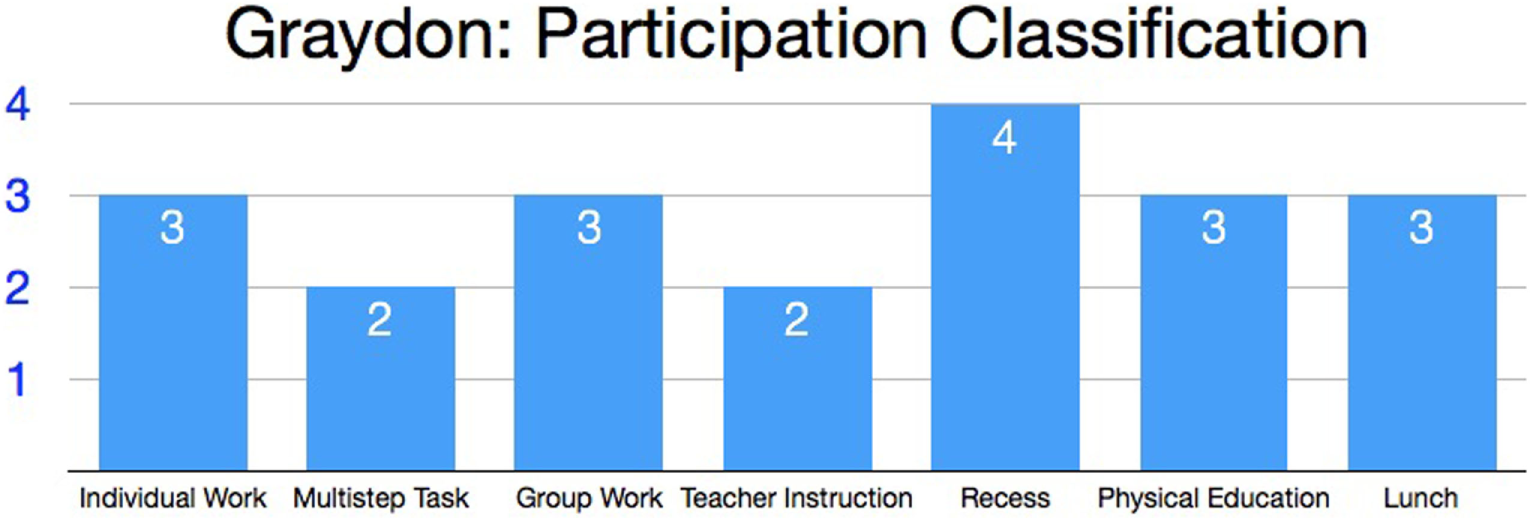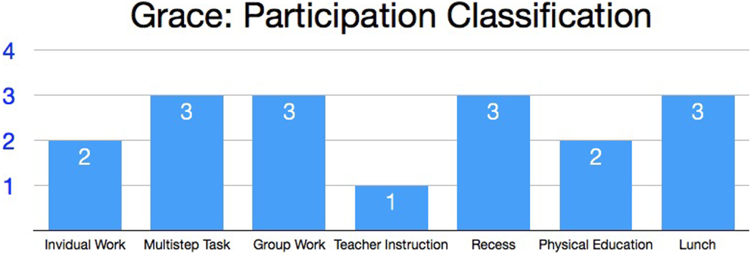 The initial step of the FACT is to classify levels of participation across environments in children who present with difficulties in participation, for example, manifesting as challenging behaviour. Participation classification is completed by educators who know the child well (e.g., teacher) for individual work tasks (e.g., reading, writing, math), multistep tasks, teacher-led instruction, group work with peers, structured group physical activities (e.g., physical education, gym), unstructured group physical activities (e.g., recess), and unstructured time in groups (e.g., lunch).