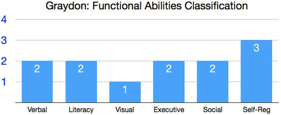 Analysis of Graydon’s profile (Figures 1 and 2) yielded a trend toward difficulties in environments tapping multiple skills, including communication, planning, and spontaneous social interactions. Specific supportive measures included trauma informed self-regulation strategies for teachers (modelling affect control and self-talk, strategic seating and support transitioning between activities) and increased structure and supervision in spontaneous social environments (e.g., recess and lunch). Executive functioning and communication supports (e.g., visual schedule, repeating, chunking) were planned for novel tasks.