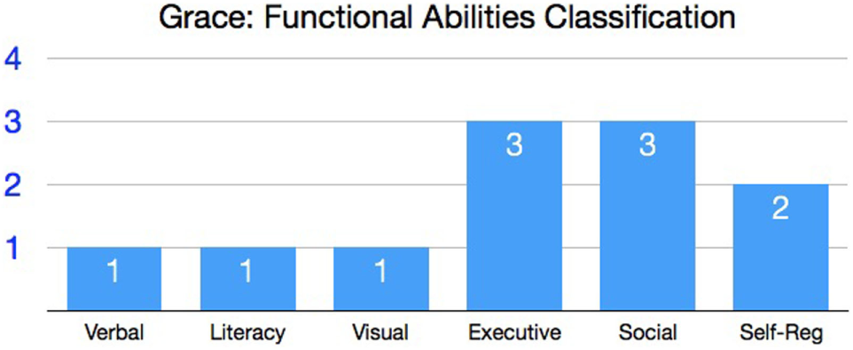 Once participation has been classified, the FACT classifies functional abilities. As discussed, FACT identifies domains of functional abilities as communication (i.e., verbal, language), visual cognitive (i.e., nonverbal cognitive), social skills, executive functioning, self-regulation (i.e., emotional stress regulation), and for school-aged children, literacy.