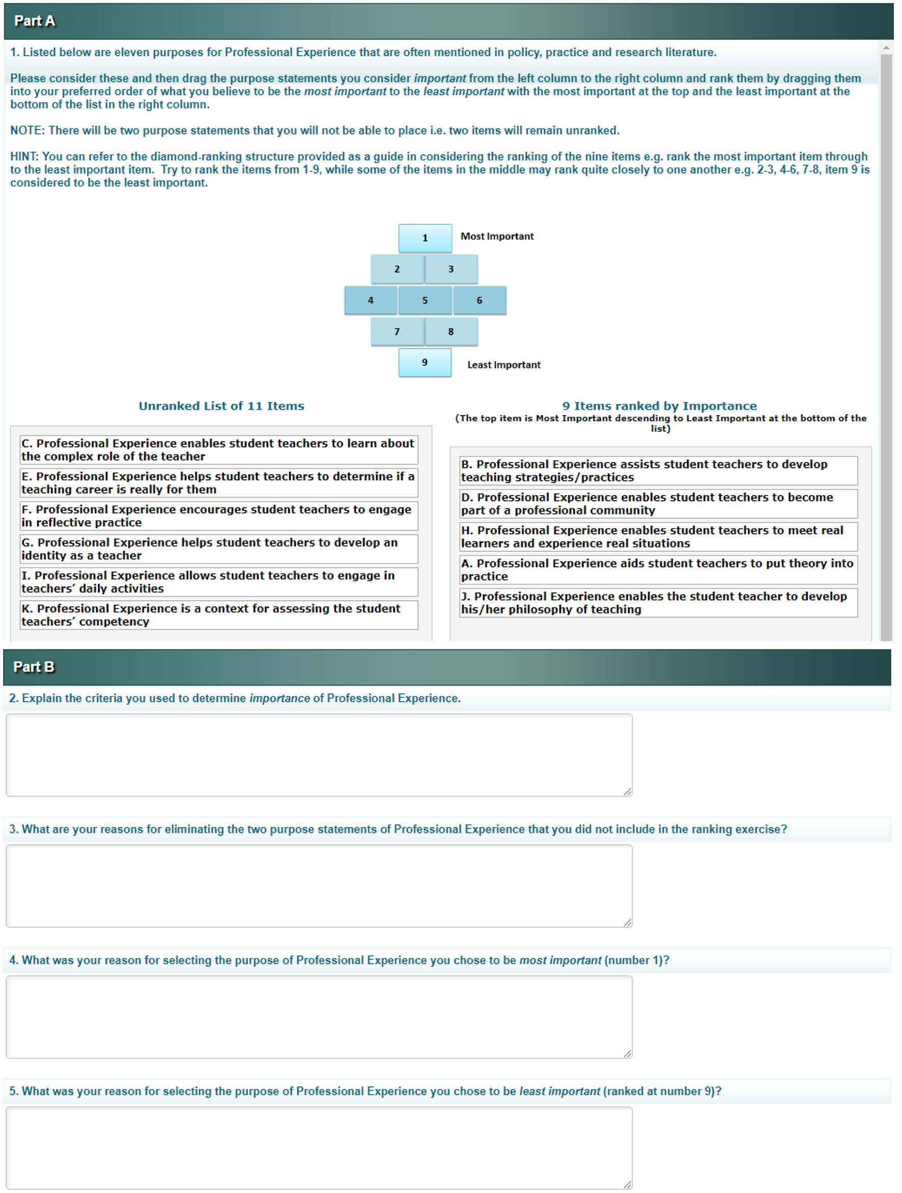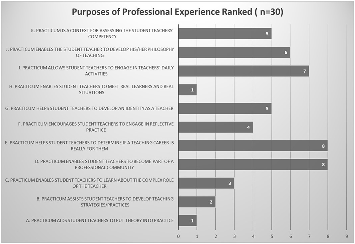 The study was guided by a mixed-method research methodology informed by Tashakkori and Teddlie (2010). The study involved two phases of data collection, however this paper reports on the findings of Phase One in line with its explicit focus on cultural change in professional experience. In Phase One, data were collected via an anonymous interactive survey which included a central question in Part 1, based on diamond ranking of 11 purposes of professional experience from most important to least important. The diamond ranking strategy is a commonly used tool in Australian classrooms. Participants were provided with a series of statements and are instructed to rank each statement and arrange them in a diamond formation. Teacher educators must place the statement with the highest priority at the top of the diamond formation and the least important statement at the bottom. The second, third and fourth rows of the diamond consist of statements that are ranked with descending priority, with each row having two, three and two statements, respectively. In the second part of the survey, there were four text response questions to ascertain the reasoning behind the ranking choices made in Part 1 (Part 1 and Part 2 shown in Appendix 1), as well as an open-ended question. The survey was completed by 30 teacher educators (n = 30) in the Faculty. Results of the diamond ranking of the purposes of professional experience in Part 1 are shown Figure 1.