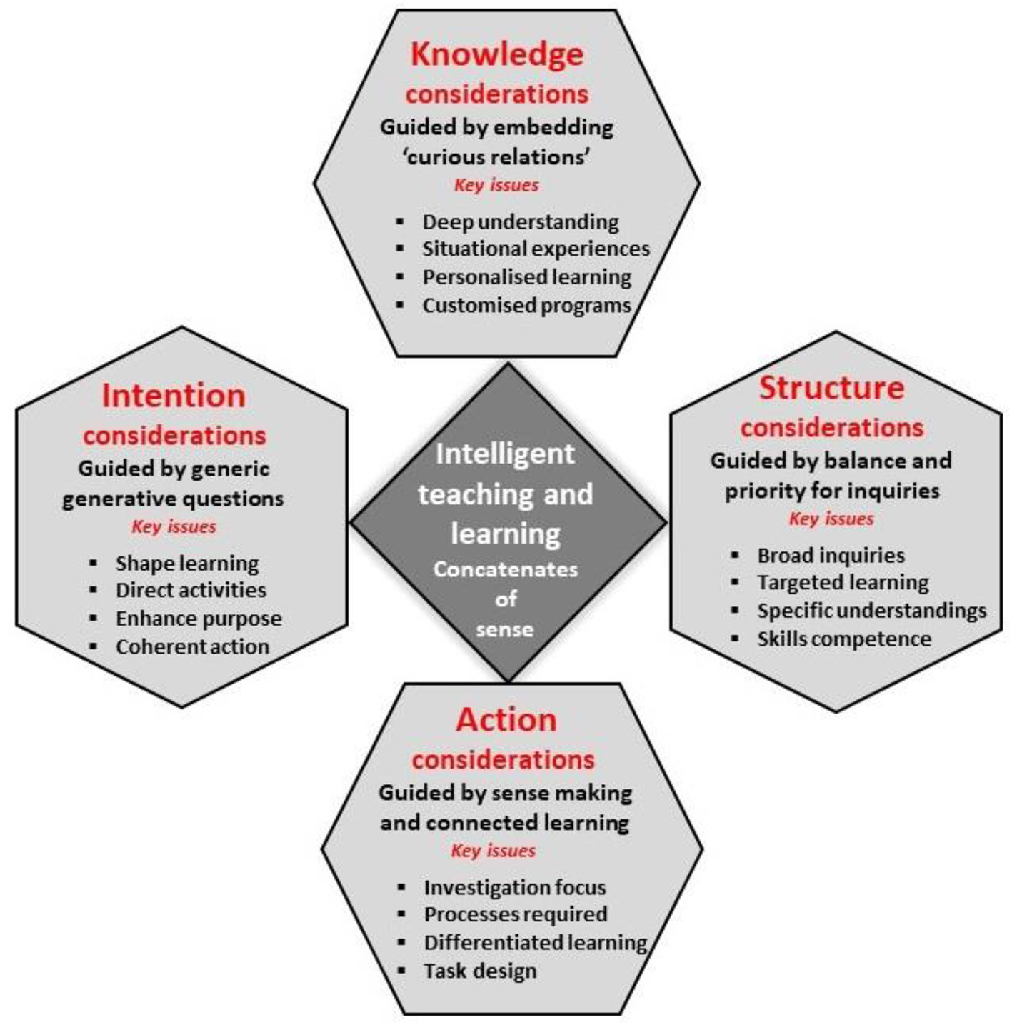 Figure 4 indicates how GGQs might become embedded in learning programs, resources and activities. Each of the interrelated considerations is equally important; one being mutually supportive of the others. Their enactment is iterative, not lock-step. Clarity of—intention, knowledge, structure and action—is an essential part of intelligent teaching and learning through which learners can formulate “concatenates of sense” and develop deep understanding. Making decisions around each of them is also a challenge and an opportunity for designers of smart digital environments and learning resources.