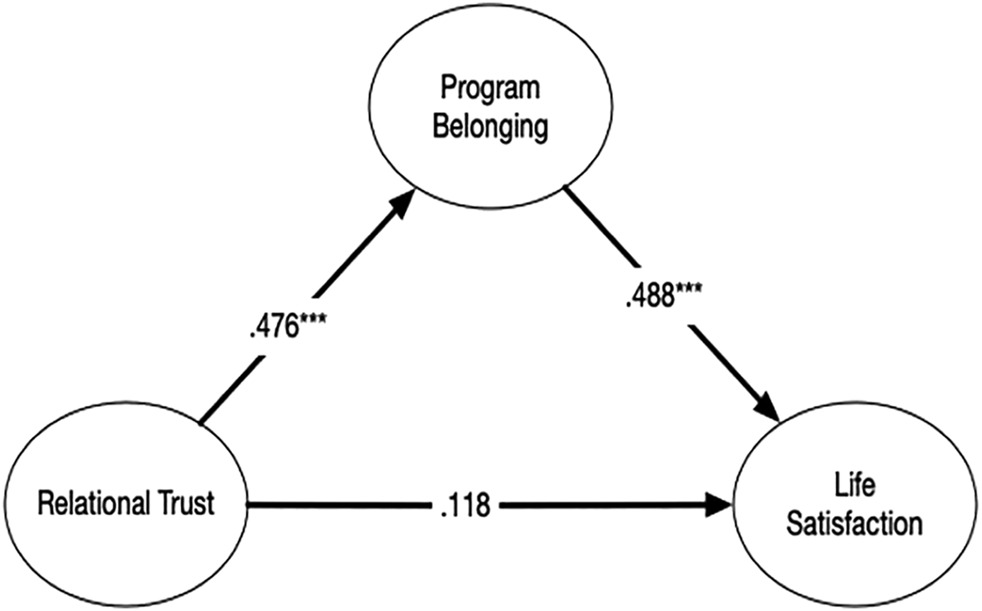 Table 2 shows zero order correlations for our variables of interest. Almost all of the variables had a moderate to weak correlation. The strongest correlation was between program sense of belonging and life satisfaction, while self-efficacy was not significantly correlated with sense of belonging or trust.