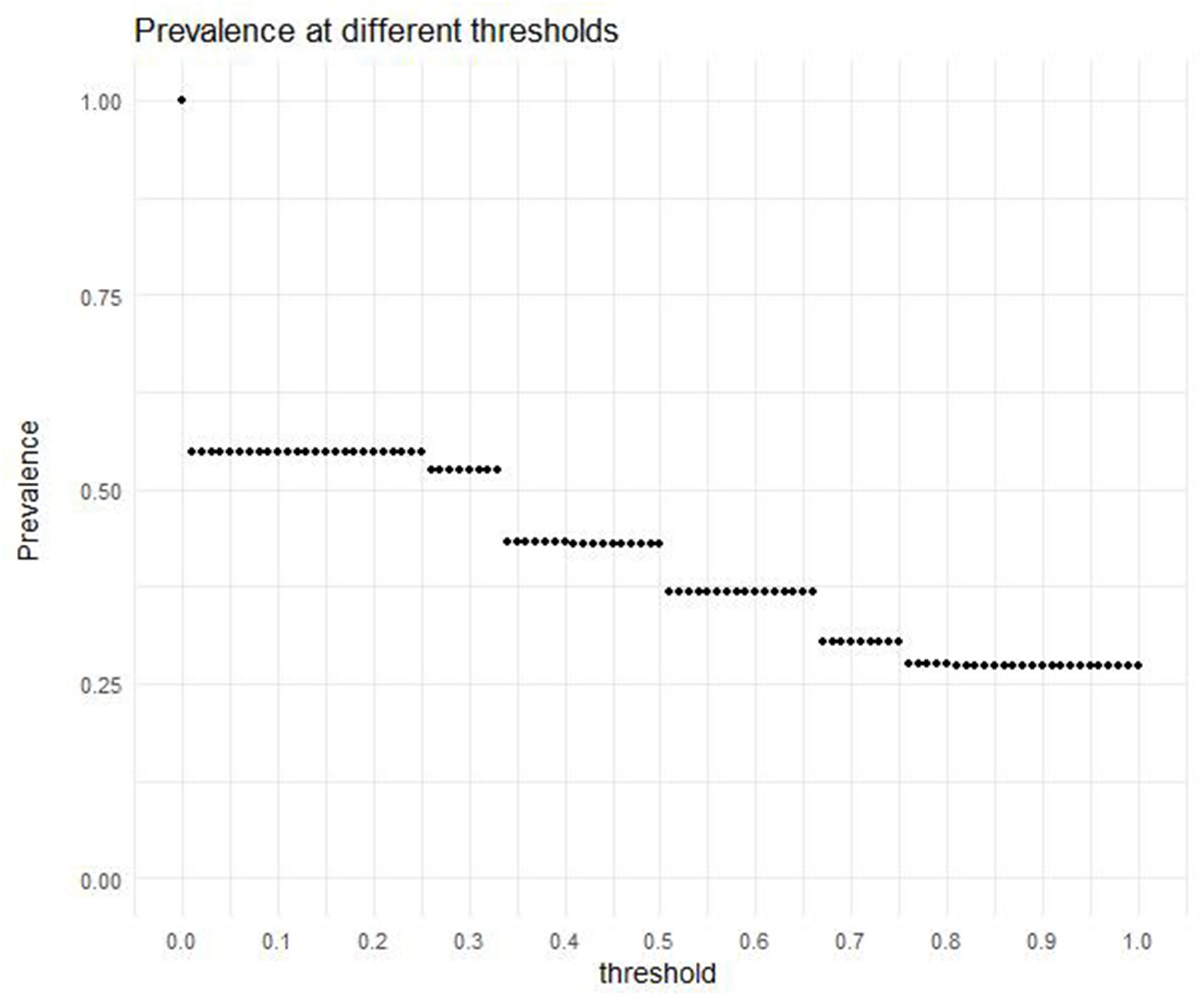 The prevalence tells us the proportion of scores in the data above the predefined threshold. It depends on the chosen threshold and influences the number of items that can be recommended to students in practice. Figure 2 shows the prevalence belonging to different threshold values between 0 and 1 (in increments of 0.01). For example, 27% of the potential gain scores (158, 270 out of 579, 622 observations) exceed a threshold of 0.90.