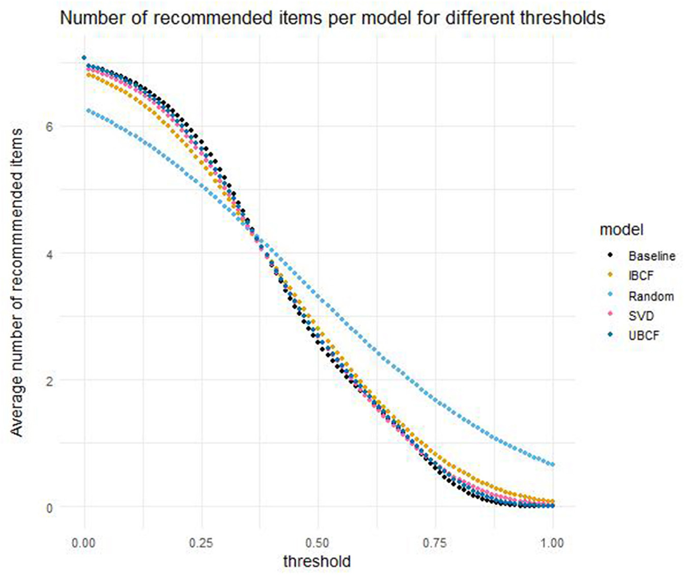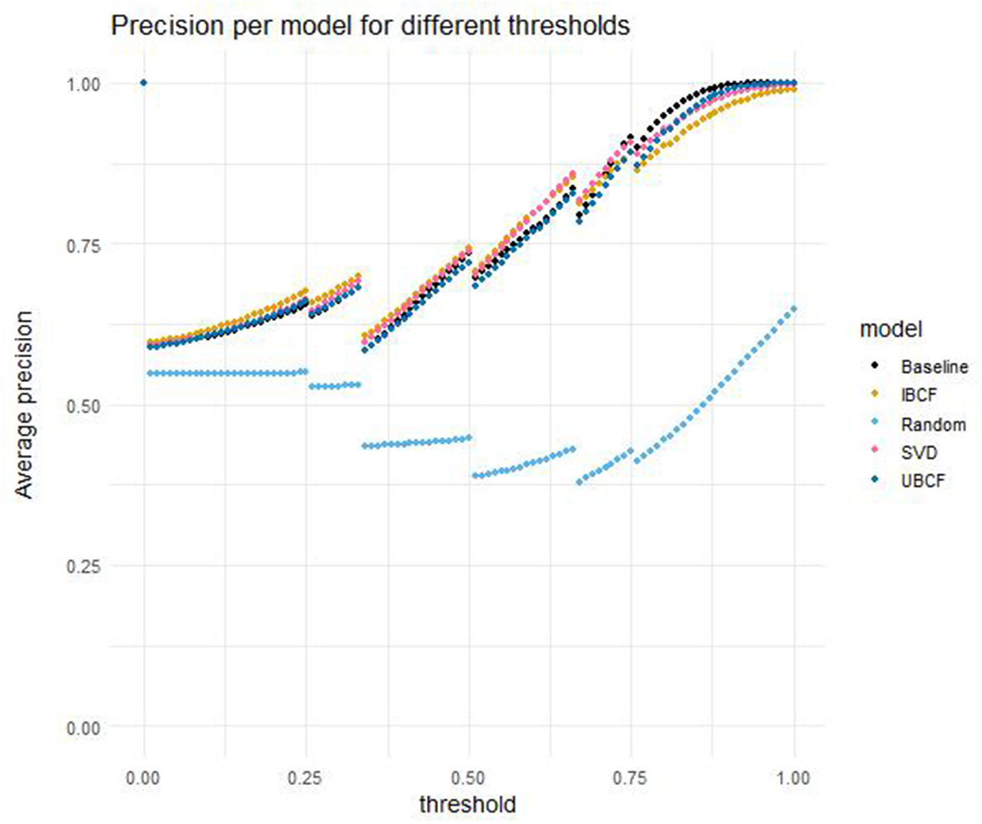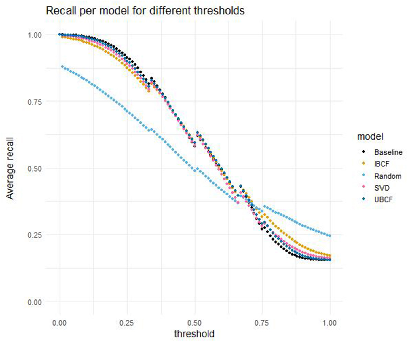 Figure 4 compares the average recall for the five different models, evaluated for the different threshold values. In general, a higher threshold leads to lower performance in terms of recall for all models. The random model outperforms the other models when the threshold exceeds 0.72. Similarly to their performance in terms of precision, the performance in terms of recall for the four other models is very similar for most threshold values. It differs more for threshold values at both ends of the scale. For threshold values equal to or below 0.39, the baseline model has the best performance in terms of recall. For threshold values between 0.40 and 0.71, UBCF usually outperforms the other models, although the differences are very small.