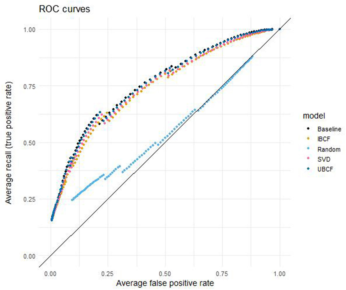 The ROC curves for the five models are displayed in Figure 5. ROC curves evaluate the false positive rate and the true positive rate (or recall) for different threshold values. A larger area under the curve (AUC) indicates better classification performance, where 1 is the best possible AUC value and 0 the worst. A random model is expected to have an AUC of 0.5, which means that it is not able to distinguish classes from each other. The random model included in this study has an AUC of 0.530. The four other models' AUCs differ only marginally: the baseline model performs best with an AUC of 0.762, after which comes UBCF (AUC = 0.758), SVD approximation (AUC = 0.747), and finally IBCF (AUC = 0.741).