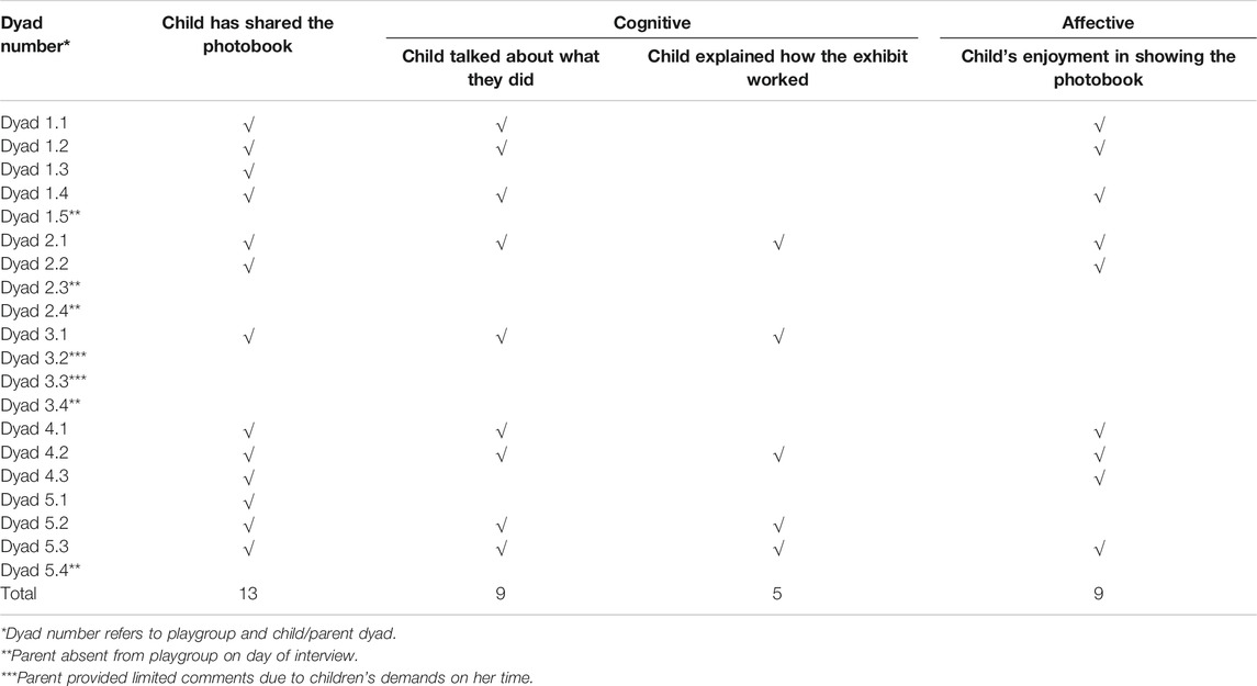 Table 4 provides a summary across the dyads of the number of parents who, during their interview 7 weeks after the Outreach program, mentioned cognitive aspects (the child had used the photobooks to talk about what they did, the child had used the photobooks to explain how the activity worked) or an affective aspect (the child had displayed enjoyment in showing the photobook to others) when discussing how their children had used the photobooks at home.