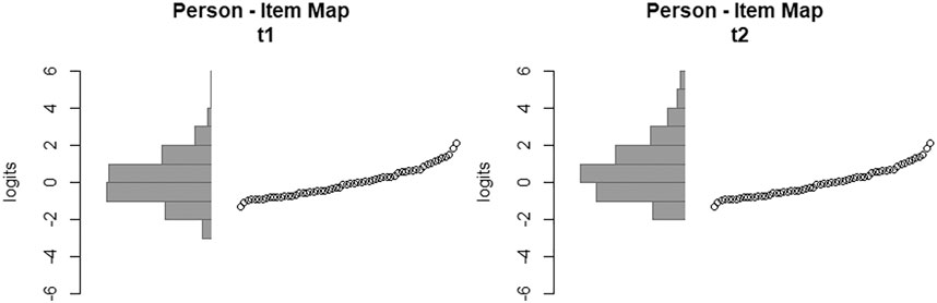 In the next step, the fit of the model and the estimates were evaluated by model tests and the reliability of the θ estimates. The Q3 Statistics reach mean values of Q3_t1 = −0.014 and Q3_t2 = −0.013 as can be expected under the assumption of local independence (e.g., Christensen et al., 2017).
