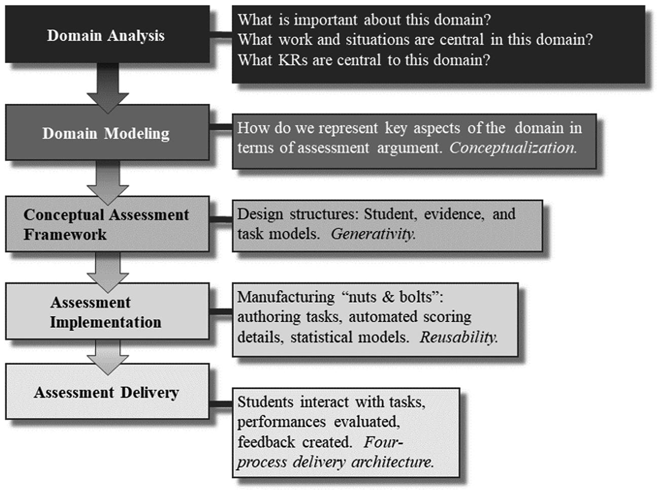 ECD is often considered a layered approach (see Figure 1) where details of the assessment increase in specificity as you move through the layers. The first layer, the domain analysis layer, explores the domain of interest. The focus is on gathering information on the important aspects of the domain, the relationship between these aspects, and representations of these aspects. This layer can include identifying standards, defining learning sequences and grouping concepts that depend on each other.