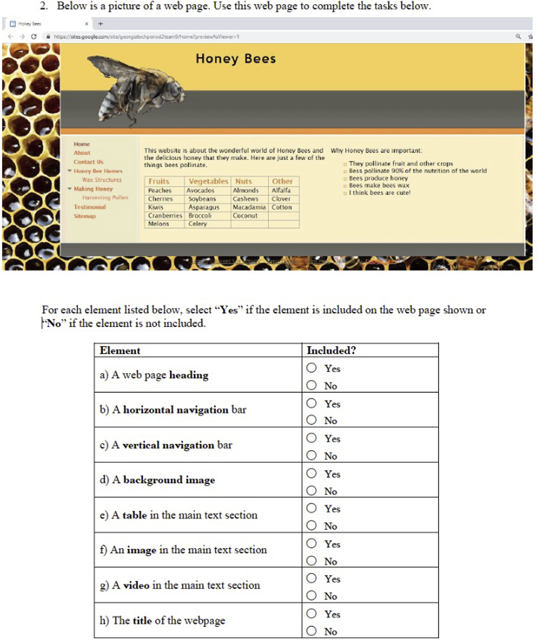 | 2 | Focus is on identifying various features of websites and how users react to those features | 8 parts, Y/N | A sample website is shown and a list of potential website elements is presented. Students respond Y/N as to whether each element is present in the sample website |