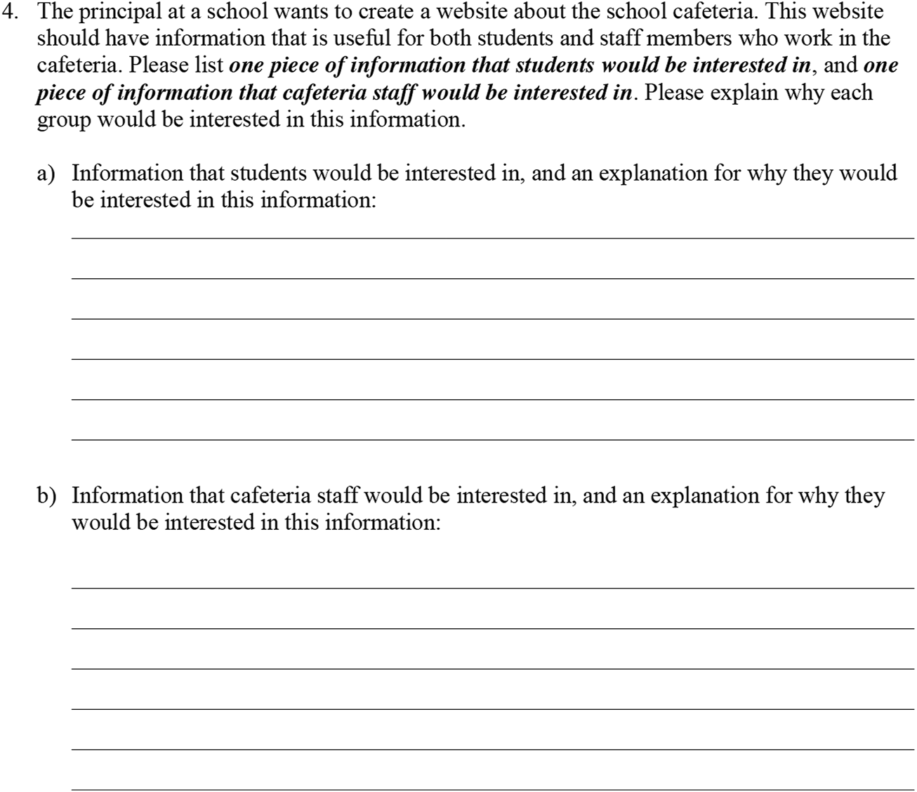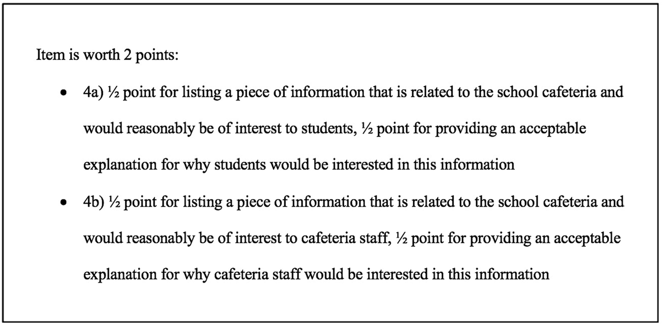 Item 4 was newly written for this assessment. In this item, students are asked to imagine that a school principal is designing a website about the school cafeteria. They are asked to suggest one piece of information for this website that would be of interest to students, and one that would be of interest to cafeteria staff members. Further, they are asked to explain why each piece of information would be of interest to the relevant group. This is an open-ended item in which students are asked to provide their answer via written text. The scoring rubric for this item is discussed below in the “Rubric Development and Sample Item Scoring” section.
