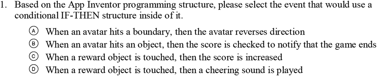 | 1 | Focus is on identifying features of an event that make it a conditional | Multiple choice | Students are asked to select from a list of game events the one that would use an IF-THEN programming structure within app inventor |