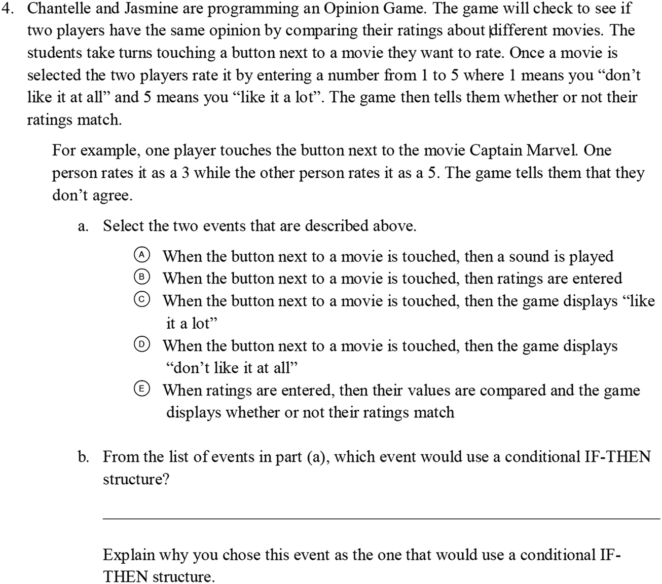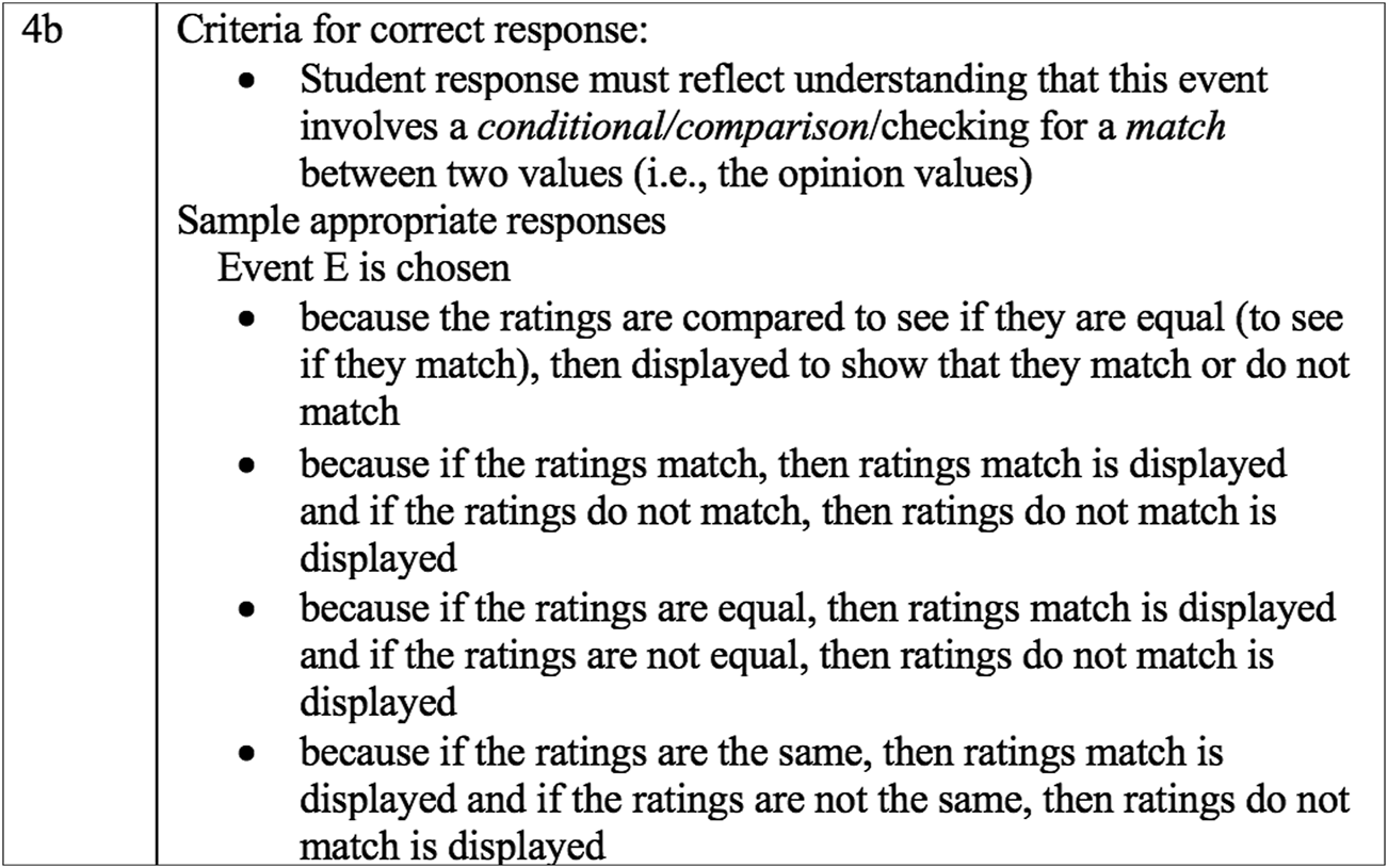 | 4 | Focus is on using game rule patterns to identify events that are termed as WHEN-THEN (4a) | 2 parts; multiple response types | Details of a game that is being programmed are described. An example occurrence within this game is described, and students are asked to identify the events included in this occurrence. Next, students are asked to select the event (from a list of events) that would be programmed using a specific programming structure, and to explain their answer |