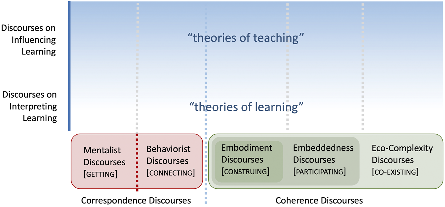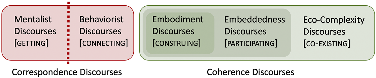 The Coherence Discourses portion of our horizontal axis is organized into three nested regions: Embodiment Discourses, Embeddedness Discourses, and Eco-Complexity Discourses. Embodiment Discourses serves as an umbrella notion that is intended to reach across perspectives centrally developed around a rejection of internal/external (mind/body; mental/physical) dichotomies. Among Embodiment Discourses, mental and physical are understood as integrated and inseparable aspects of the body. Phrased differently, the body is not seen as something that a learner learns through, but as the learner. In suit, behaviors are not seen as goals or indications of learning, but as integral to learning.