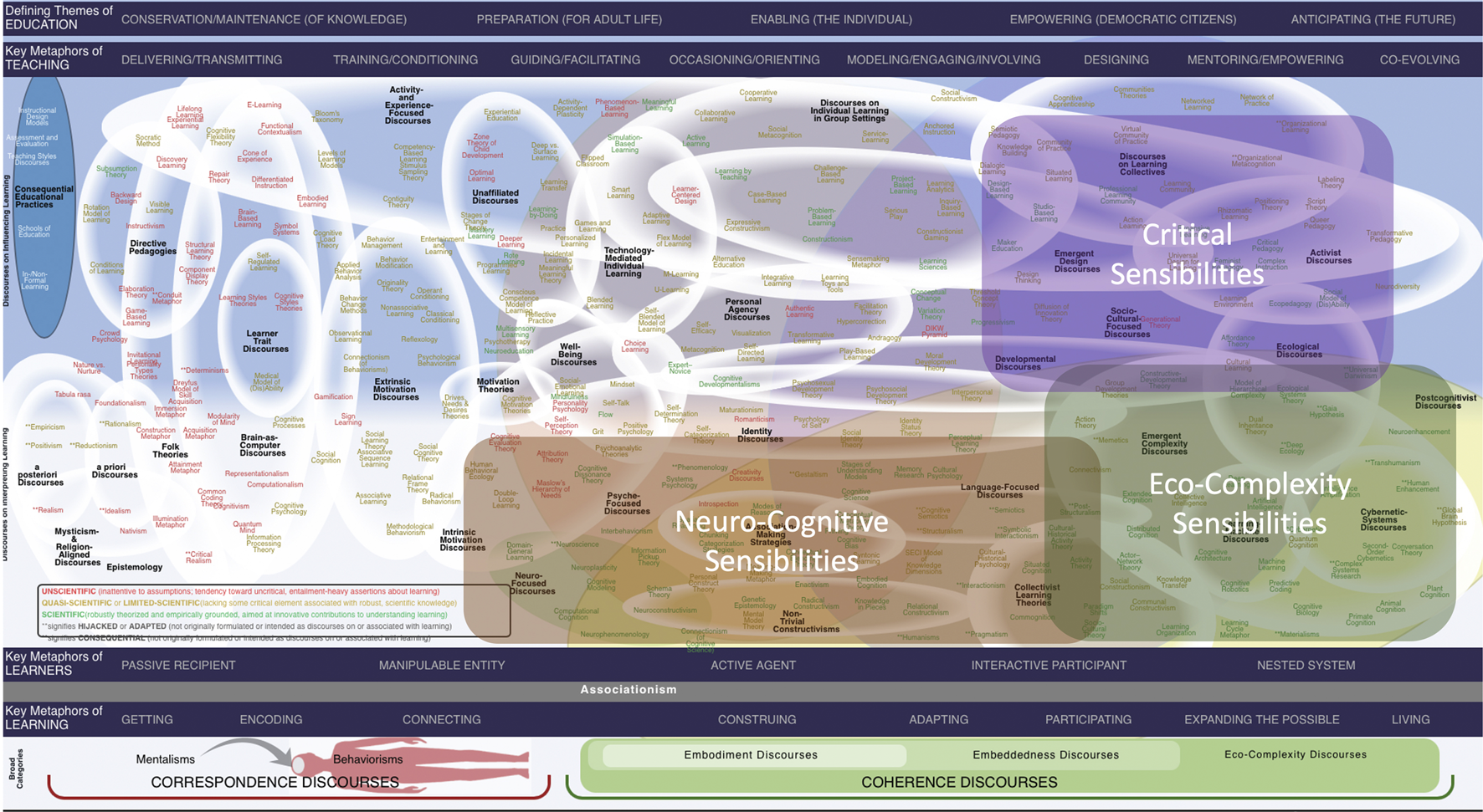 There are also some hard-to-place discourses that are articulated in ways that can be embraced across sensibilities. Examples include Learning Transfer, Mastery Learning, and Learning-by-Doing—none of which commit to specific principles of learning or models of teaching. Others in this cluster, such as Deep vs. Surface Learning (Marton and Säljö, 1976), sit across regions by virtue of their explicit contrasts of correspondence-oriented and coherence-oriented sensibilities. These we gathered in a cluster labeled “Unaffiliated Discourses,” acknowledging that the strategy of flagging multiple zones for them is not especially informative.