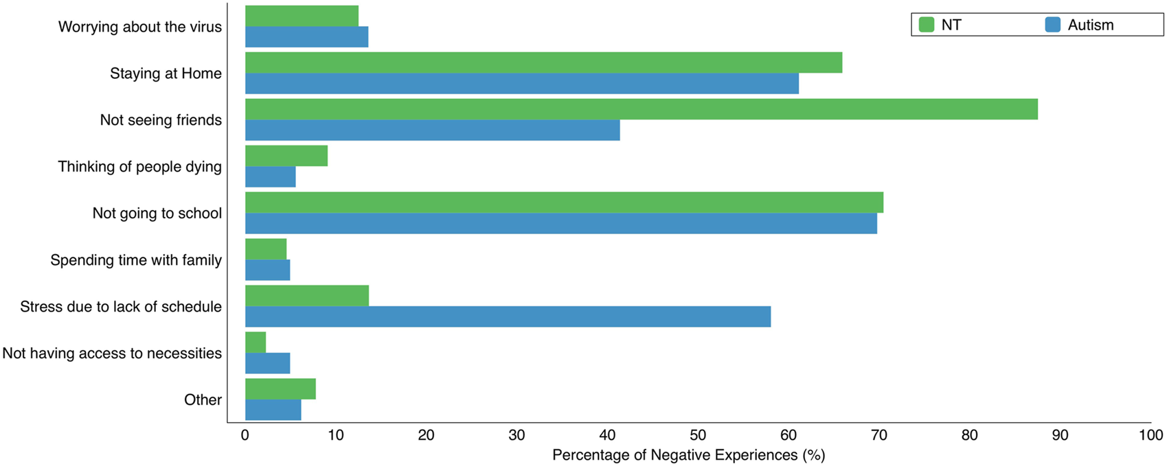 Parents were asked to select the top three most negative experiences of the pandemic from a list of nine choices (see Figure 1). Consistent with our hypotheses, results indicated that not seeing friends was the most frequently selected concern for the parents of neurotypical children, but stress related to schedule disruption was the most significant concern for children with autism. We observed comparable distributions across the other stressors (worrying about the virus, access to necessities).
