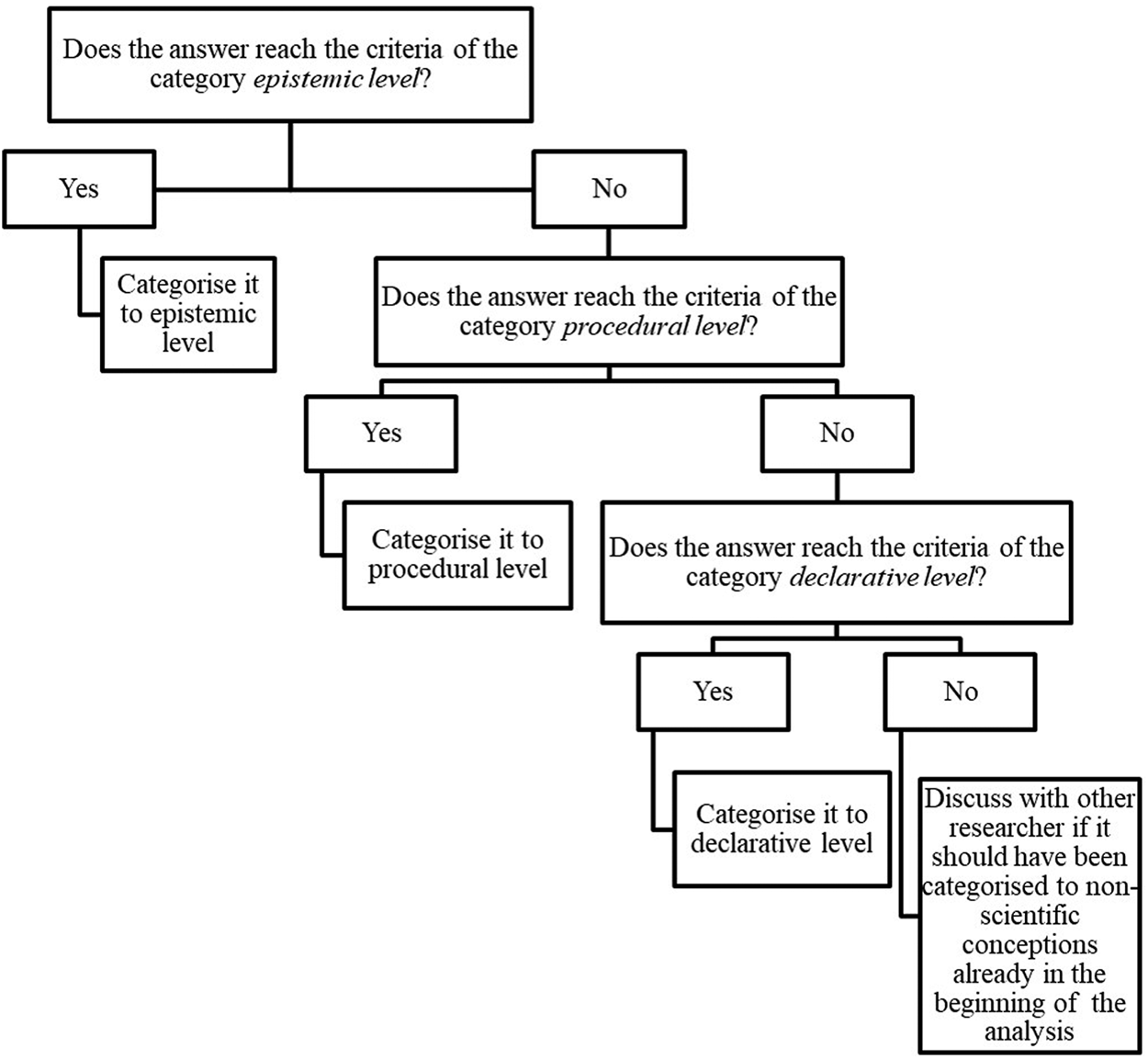We assume that these categories describe the developmental stages, meaning that one must have reached declarative level before to be able to understand the concept in procedural level and both declarative and procedural level must have been reached before to be able to understand the concept in epistemic level. In this study we were interested in the level of their current conceptions. Each answer was categorized to only one category because the aim of the analysis was to find out in which of these levels each student’s conceptions currently stand, i.e. what it the highest of these levels that each student’s answer reaches. The first and the second author of this study analysed 30% of the data by coding the answers on the basis of the categorisation. Inter-rater reliability was 86%. The first author analysed the rest of the data. The idea of categorization is explained more detailed in Figure 1.