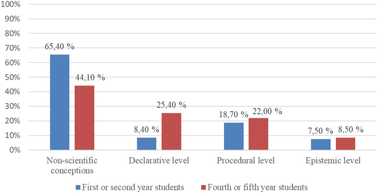 The total number of students’ answers classified to each category is presented in Table 3. Strengthening our assumption about the complex nature of the concept of theory, the analysis revealed that over half (53.6%) of all the students’ were not able to report their conception of theory in a scientific context. When looking at the scientific conceptions, only a few students showed understanding of the concept at the epistemic level. About one fifth of the students were able to describe the concept at procedural level and about the same number of students at the declarative level.