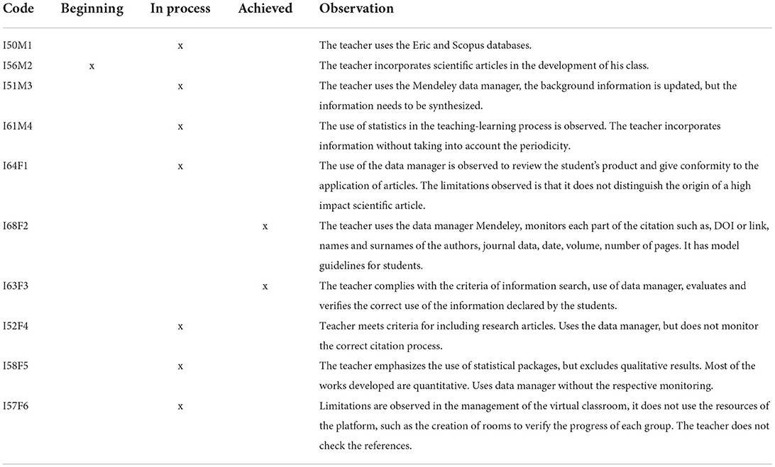 The results are divided into two subcategories: Informational competence (Table 5) and technology use (Table 6). The execution took place in two moments: the first comprised the interviews, and the second the review of the recorded sessions of the class.