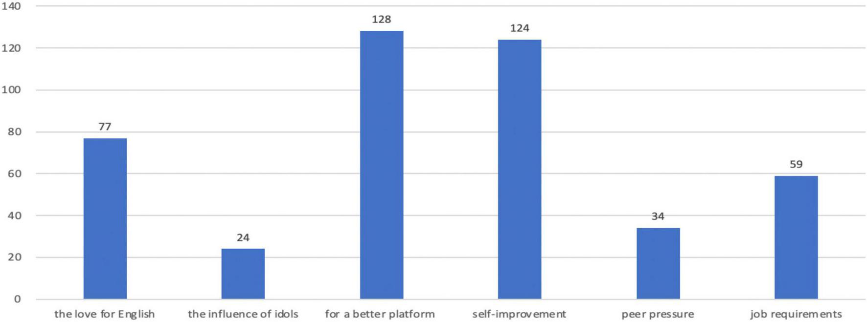 Figure 1 shows that students have various motivations to further their studies as English translation majors at the beginning of their 2-year studies. Among them, 128 students take the pursuit of a better platform as their initial motivation for their master’s studies; 124 students regard self-improvement as their initial motivation; 77 students further their master’s studies just because of their love for English; 59 students choose to be a postgraduate majoring in English because of job requirements. In addition, 34 students further their studies because they are affected by their peers; 24 students are influenced by their idols to become a postgraduate. To be exact, the first three factors are intrinsic ones, which play a more important role in motivation than the latter three extrinsic factors.