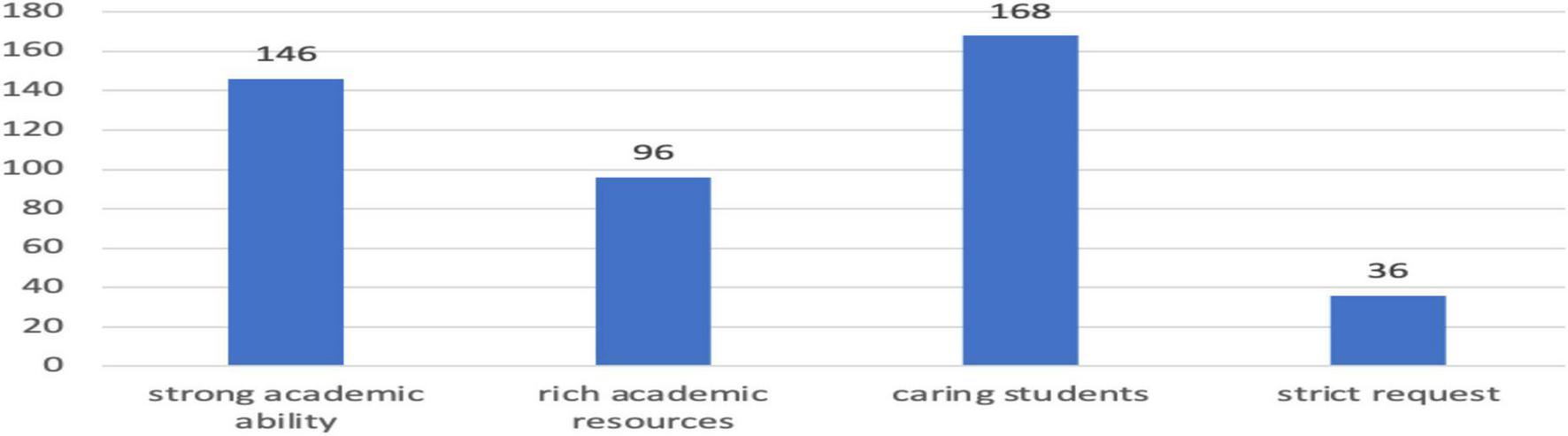 Figure 2 shows the affordances of mentors, including strong academic ability, rich academic resources, care for students, and strict requests. As shown in Figure 2, 168 participants think that mentors’ care for students is the most important factor in their motivation; 146 participants hold that their mentors’ strong academic ability motivates them most; 96 participants believe that their mentor’s rich academic resource is the most important factors behind their motivations. Additionally, 36 students think that the strict requests made by the mentor give them the most affordance.