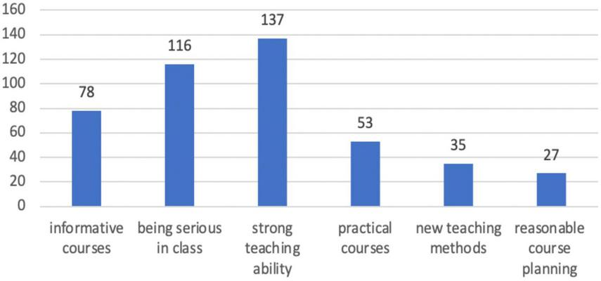 Figure 3 demonstrates the affordances of instructors, including informative courses, being serious in class, strong teaching ability, practical courses, new teaching methods, and reasonable course planning. 137 students believe that instructors’ strong teaching ability ranks first in terms of its effect on motivation; 116 students think that a lecturer’s attitude of being serious in the class motivates them most; 78 students hold that the informative course is the main factor affecting their motivation; 53 students believe that informative course is the vital factor affecting their motivation; 35 students think that new teaching method motivates them most; 27 students believe that reasonable course planning motivates them most.