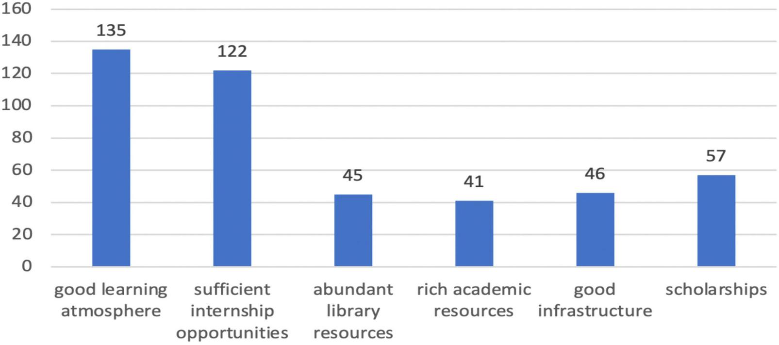 The affordances of the institution are demonstrated in Figure 4, which include a good learning atmosphere, sufficient internship opportunities, an abundant library, rich academic resources, top-class infrastructure, and scholarships. Among them, 135 participants regard a good learning atmosphere as the most vital factor behind their motivation; 122 participants think that sufficient internship opportunities are very essential in their motivation toward their language learning; 57 participants view scholarship as the crucial factor influencing their motivation. Moreover, 46 participants think that the world-class infrastructure provided by the institution affects their motivation for language learning most. Besides, 45 participants take abundant library resources as the most important factor behind their motivation, and 41 participants think rich academic resource influence their motivation most.